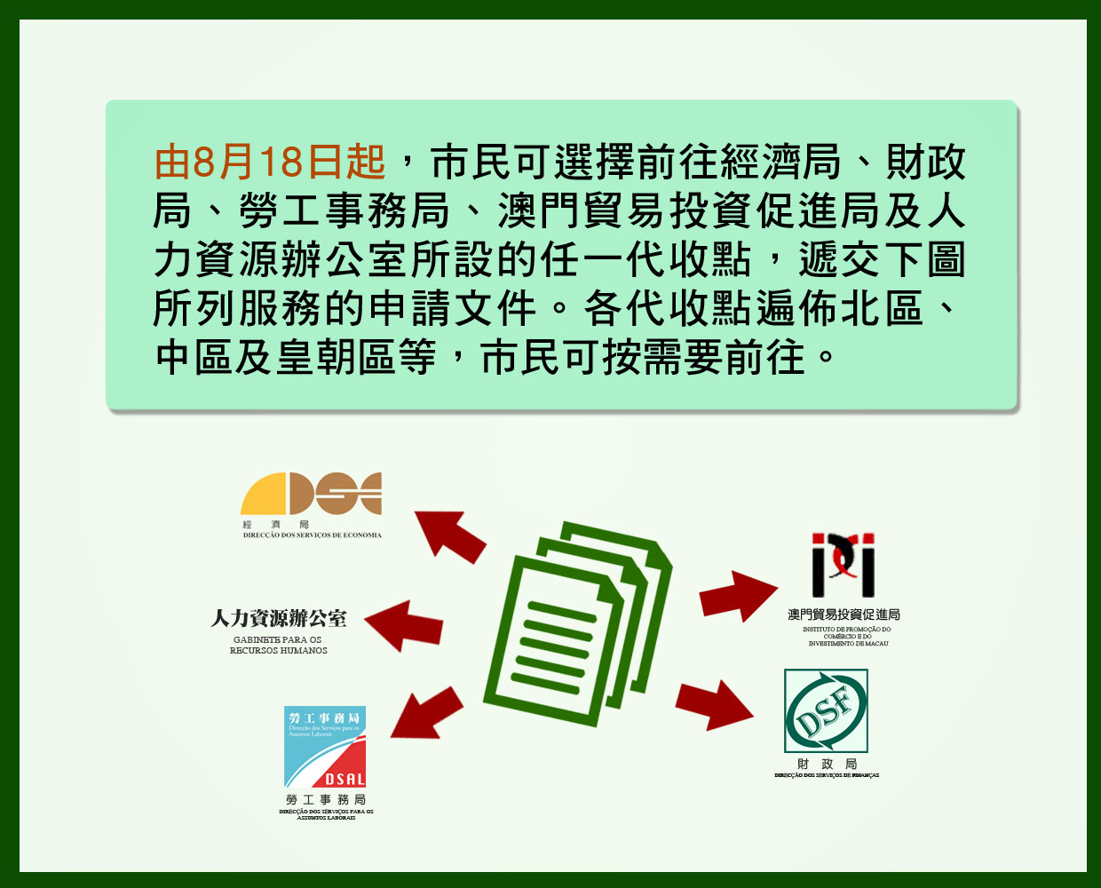 由8月18日起,市民可前往經濟局、財政局、勞工事務局、澳門貿易投資促進局及人力資源辦公室所設的任一代收點,遞交附表所列服務的申請文件(詳見附表)。各代收點遍佈北區、中區及皇朝區等,市民可按需要前往。
