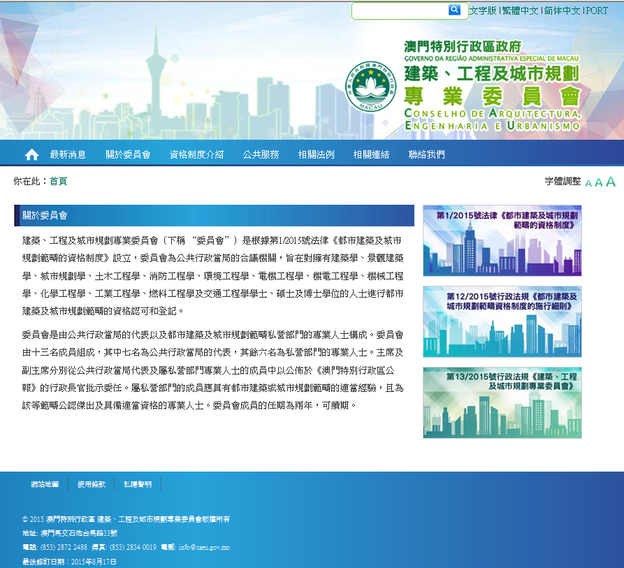 第1/2015號法律《都市建築及城市規劃範疇的資格制度》(以下簡稱“資格制度”)已於7月1日生效,十三個專業範疇學位的人士,可透過認可和登記獲取專業資格,並在經註冊後取得執業資格。特區政府期望透過資格制度的建立,配合社會發展、有效規範相關行業,提高建築及城市規劃專業的地位,並最終達至與國際接軌、將澳門提升為專業型城市的目標。土地工務運輸局即日起接受符合過渡規定人士申請專業資格認可和登記,以便這些現職專業人士完成註冊或註冊續期,繼續從事職務。