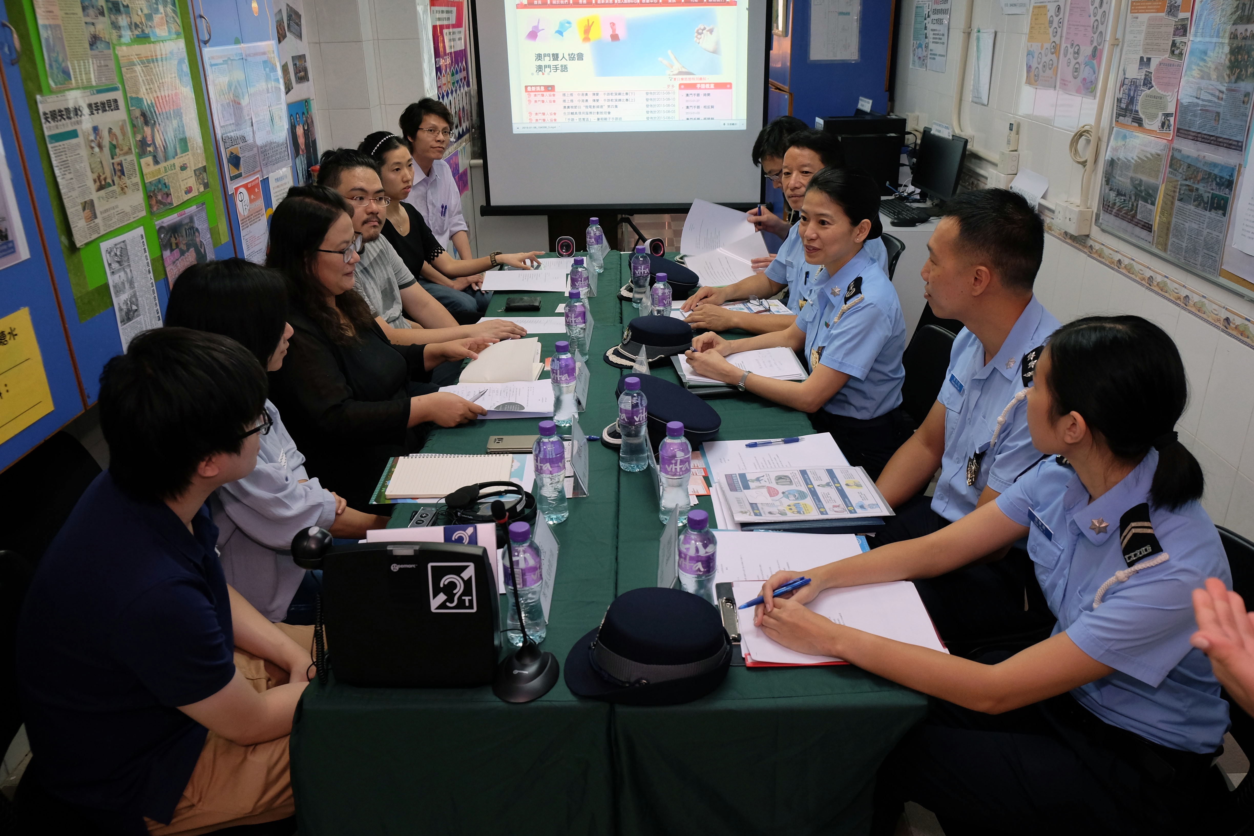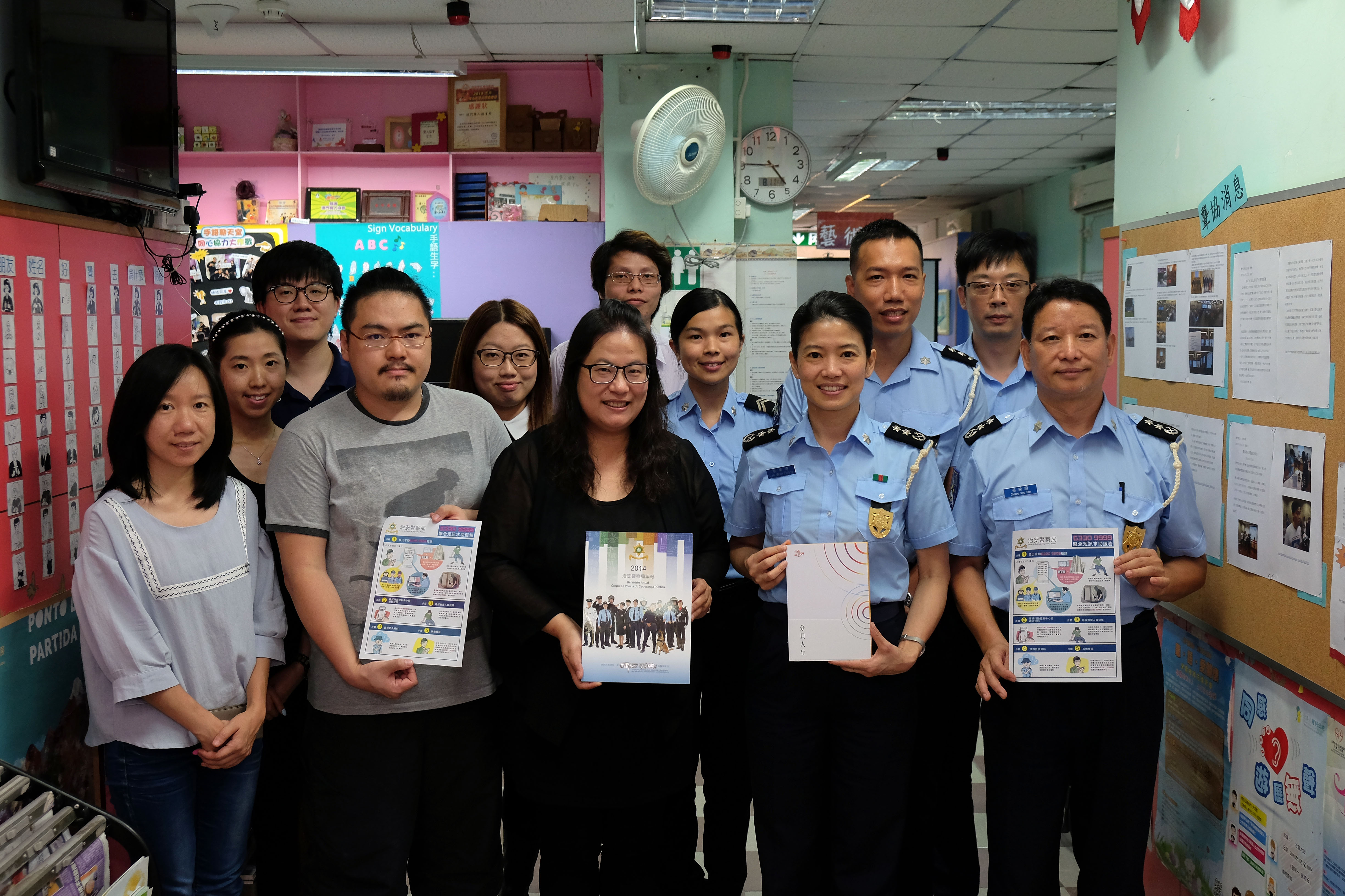 會上,治安警察局代表向協會了解本澳聾人的情況,對於聾人的治安需要治安警察局表示關注,現時聽障或語言障礙人士如有需要致電治安警察局999緊急求助熱線,會透過傳真或他人協助的方式向治安警察局作出求助;為向聽障或語言障礙人士提供更適當的緊急報案渠道,治安警察局自去年年初已籌備開發一套以電話短訊向本局進行緊急求助的系統,目前,短訊報案系統已進入測試階段,將於短期內推出有關服務。屆時,聽障或語言障礙人士可透過本澳各電訊公司的電話短訊服務向治安警察局專線發出求助或舉報訊息,接報警員透過系統與報案人進行文字上的溝通後,將按一般緊急求助的程序派員處理。