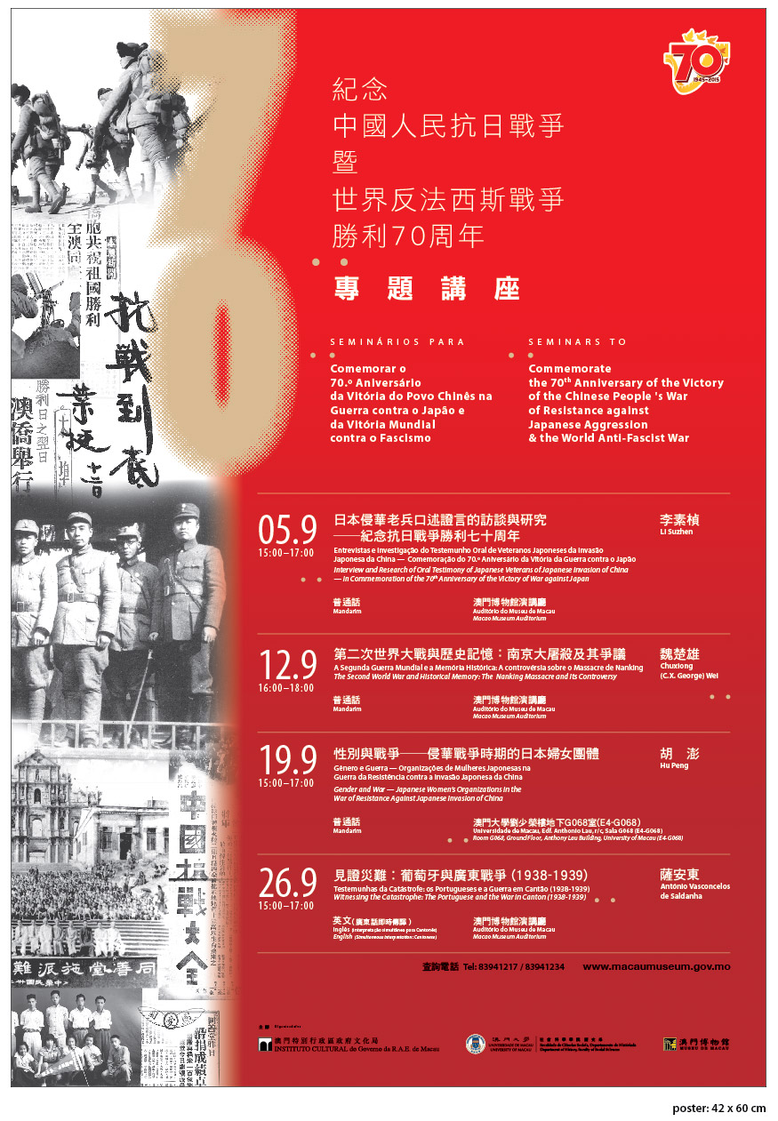為紀念抗日戰爭勝利七十周年,澳門特別行政區政府與中央人民政府駐澳門特別行政區聯絡辦公室主辦《紀念中國人民抗日戰爭暨世界反法西斯戰爭勝利七十周年展覽》,活動由新聞局、文化局與澳門日報承辦,民政總署與教育暨青年局支持。由文化局澳門博物館及澳門大學社會科學學院歷史系聯合舉辦的四場系列專題講座,將於九月展覽期間逢周六下午進行,費用全免,座位有限,歡迎報名參與。