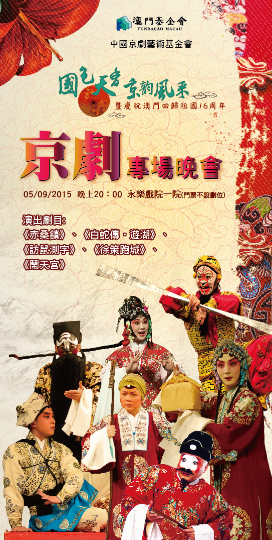 為弘揚中國優秀傳統文化,提高澳門市民對國粹京劇藝術的欣賞水平,由中國京劇藝術基金會和澳門基金會共同主辦的“國色天香、京韻風采――暨慶祝澳門回歸祖國16周年京劇專場晚會”,將於9月5日晚上八時在澳門永樂大戲院隆重開演,並於9月3及4日向公眾免費派發入場門票。