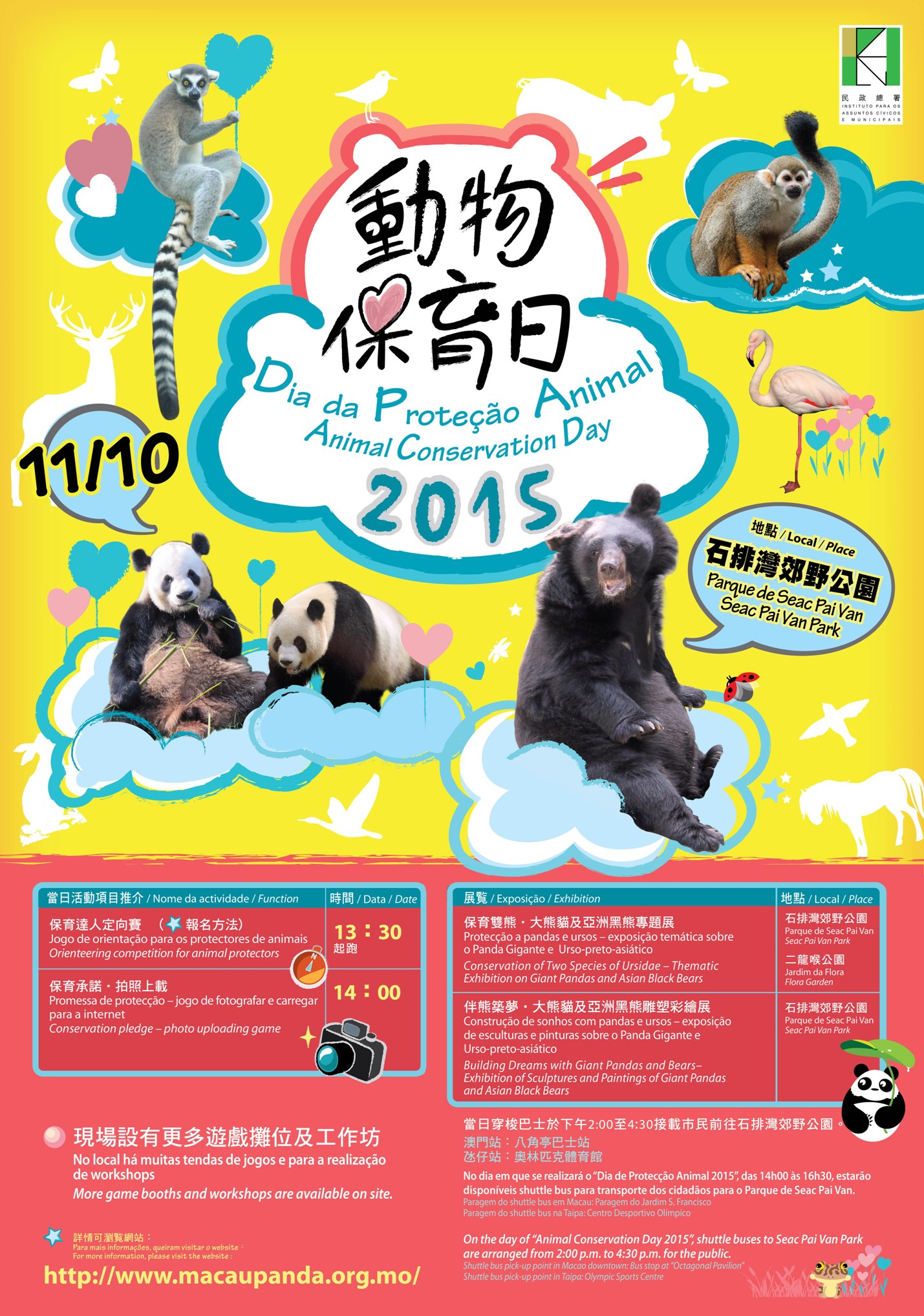 因受十月四日颱風天氣影響,為顧及參加者安全,民政總署決定將“2015動物保育日”順延至本周日(十月十一日)下午二時至五時三十分在路環石排灣郊野公園舉行。現場設有多項有趣又有意義的活動及展覽,大熊貓館亦免費對外開放,歡迎一家大小前來參與,共同宣揚愛護動物的訊息。