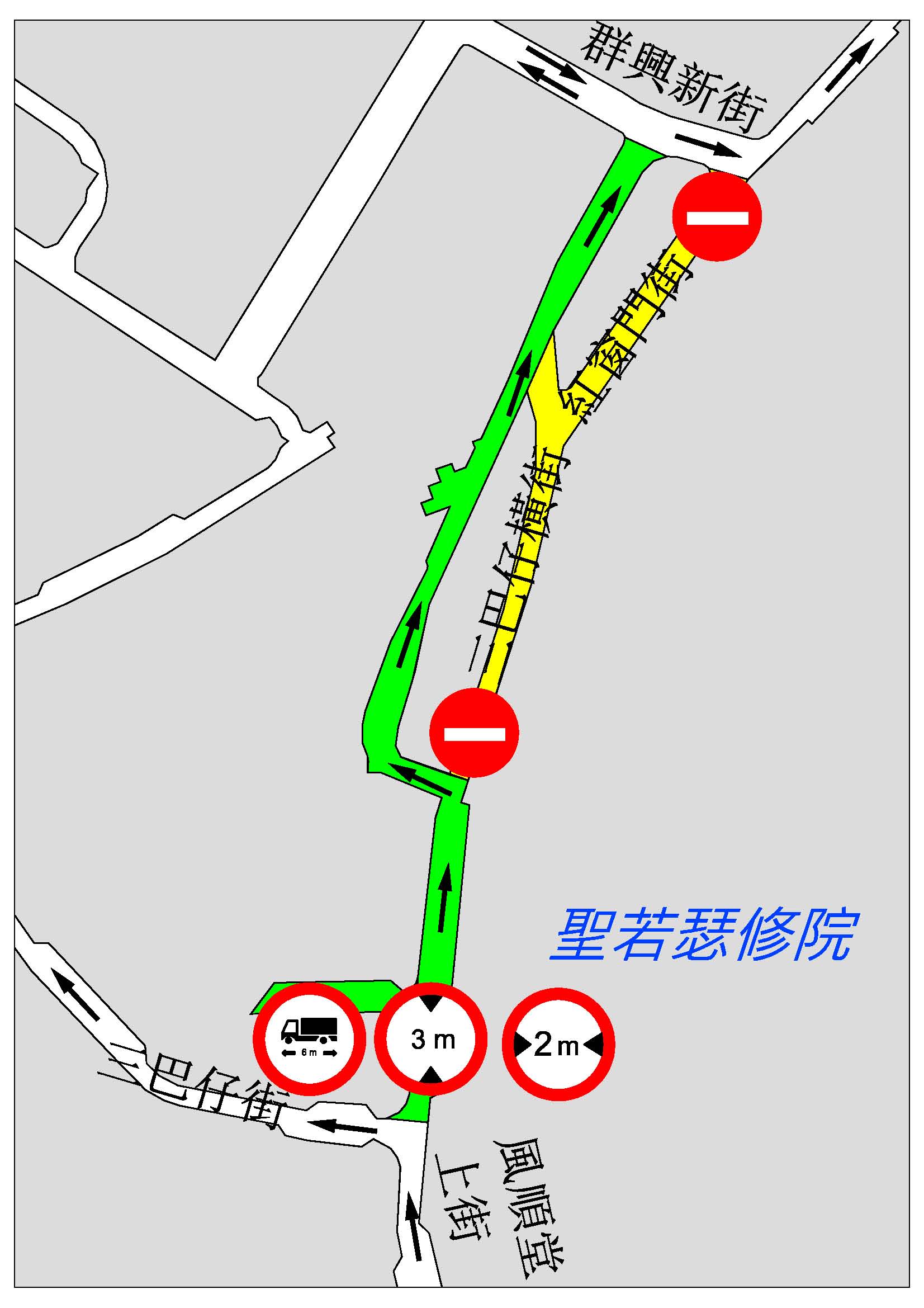 配合水管、電纜及管道鋪設,本月12日(周一)上午10時起,介乎輝星大廈與群興新街之間的三巴仔橫街及紅窗門街將實施封閉交通。同時,禁止車身長度超過6公尺、高度超過3公尺及寬度超過2公尺的車輛由風順堂上街進入三巴仔橫街,工期21日。