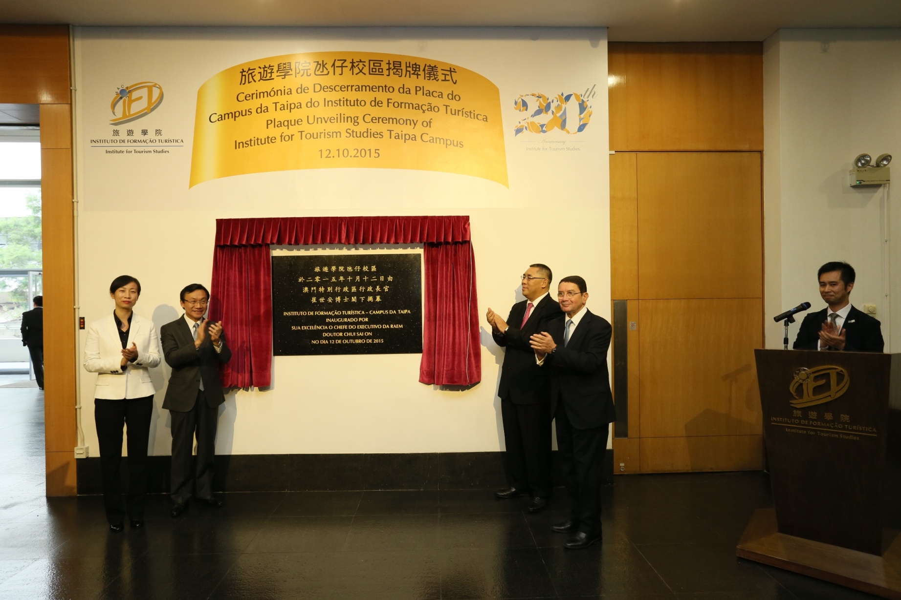 旅遊學院氹仔新校區揭牌儀式於10月12日在澳門大學原圖書館舉行,由澳門特別行政區行政長官崔世安博士在社會文化司司長譚俊榮博士和聯合國世界旅遊組織秘書長塔勒布∙瑞法依博士見證下揭幕。學院亦邀請教職員、學生、本地及海外嘉賓和合作伙伴一同參與見證此重要的里程碑,學院將突破現有校園規模所限,獲得更好的條件,提供更多具質素的旅遊教育和培訓。