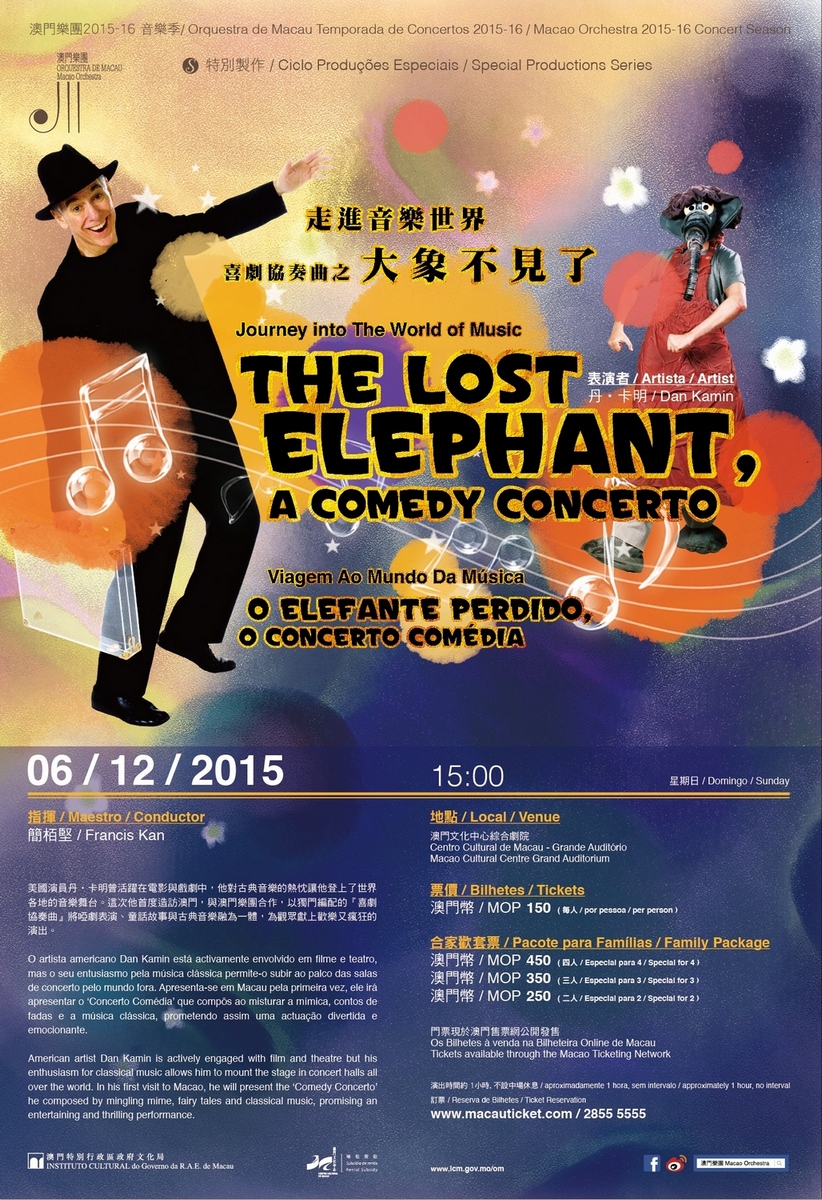 文化局澳門樂團將於十二月六日(星期日)下午三時在文化中心綜合劇院與著名美國演員丹‧卡明(Dan Kamin)攜手,在簡栢堅的指揮下呈獻走進音樂世界《喜劇協奏曲之大象不見了》音樂會,丹‧卡明將在虛擬的音樂森林中以精彩的動作技巧,配合各種代表動物的簡單道具,與觀眾尤其小朋友擦出激動火花,並藉此機會向他們介紹古典音樂。