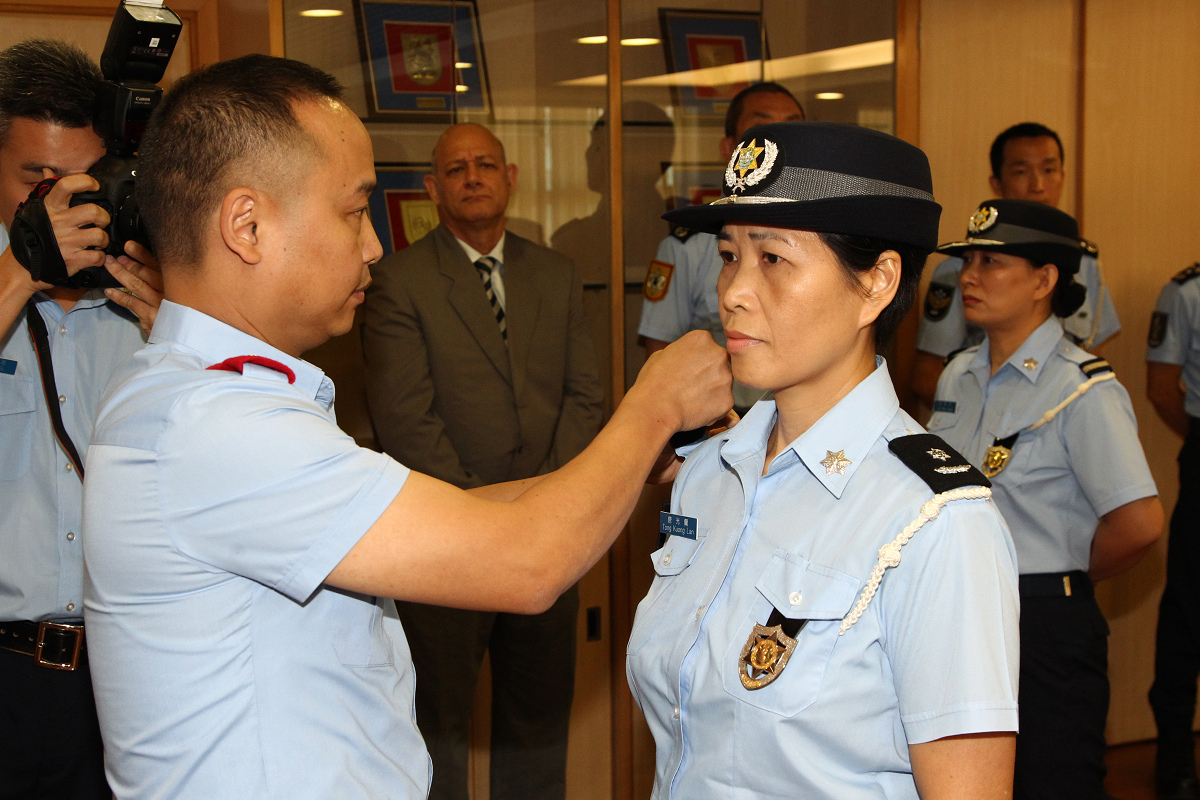 今天(10月29日)中午12時,在治安警察局總部舉行警長晉升儀式。儀式由治安警察局副局長吳錦華副警務總監主持,各部門主管均有出席。儀式簡單而莊嚴,各領導及主管為獲晉升警長人員戴上新肩章,並作出熱烈祝賀。