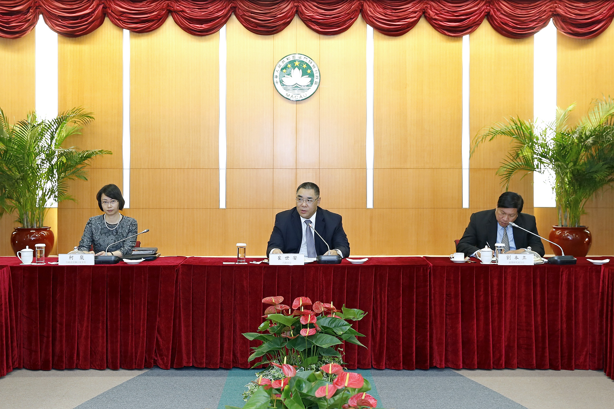 行政長官崔世安今(4)日在政府總部與專家學者座談,就政府明年施政工作和維持社會經濟穩定發展等多樣議題聽取意見及建議。