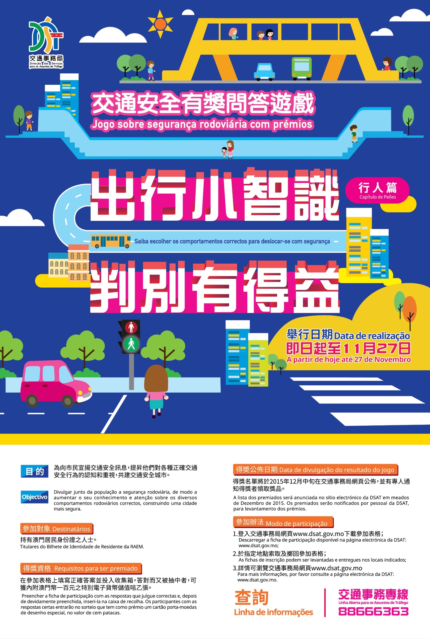 本年最後一期“行人篇”「出行小智識 判別有得益」交通安全有獎問答遊戲推出,即日起至11月27日,市民可前往交通事務局服務專區、永久駕駛學習暨考試中心、街總、工聯、婦聯、民建聯轄下部份對外服務機構索取參加表格,亦可登入交通事務局網頁www.dsat.gov.mo下載,填妥後交回上述地點,答對問題即可自動參加抽獎,每名得獎者可獲特別版電子貨幣儲值咭一張,名額50名。
