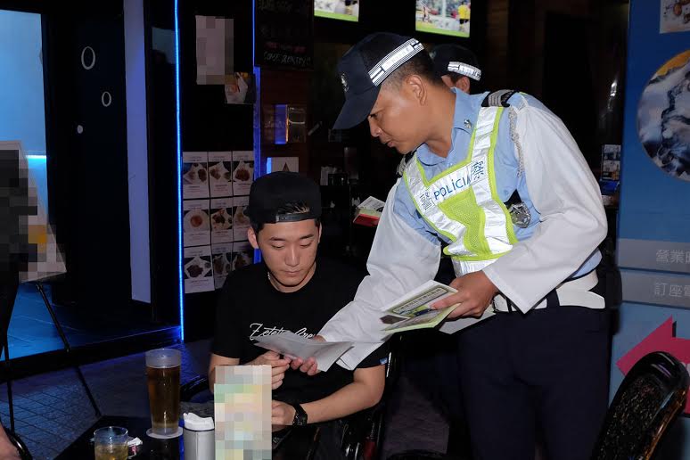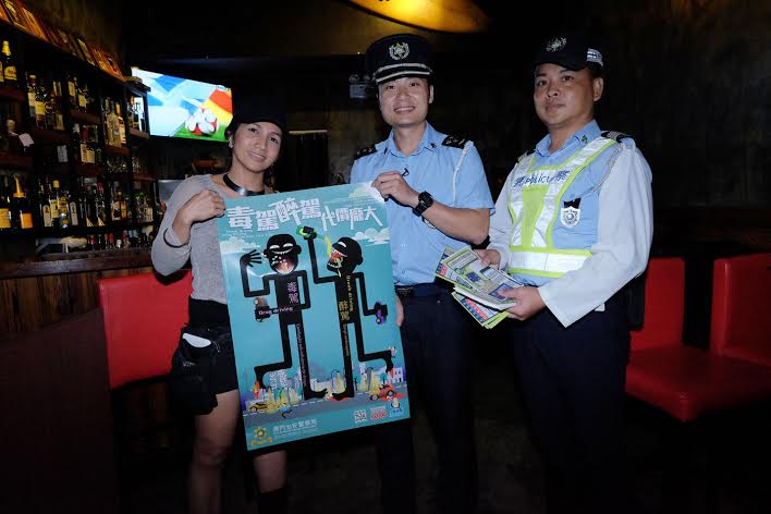 「2015交通安全推廣」活動陸續展開,治安警察局為提高廣大市民的交通安全意識,於11月7日晚在宋玉生廣場酒吧街一帶進行預防毒駕醉駕之宣傳活動,藉此向市民及旅客推廣切勿酒後駕駛、遠離毒品及交通安全訊息。隨後並針對酒後駕駛及超速等行為展開交通檢控行動。治安警察局冀透過宣傳、教育及檢控三管齊下,加強道路使用者的守法意識,從而減少交通意外的發生。