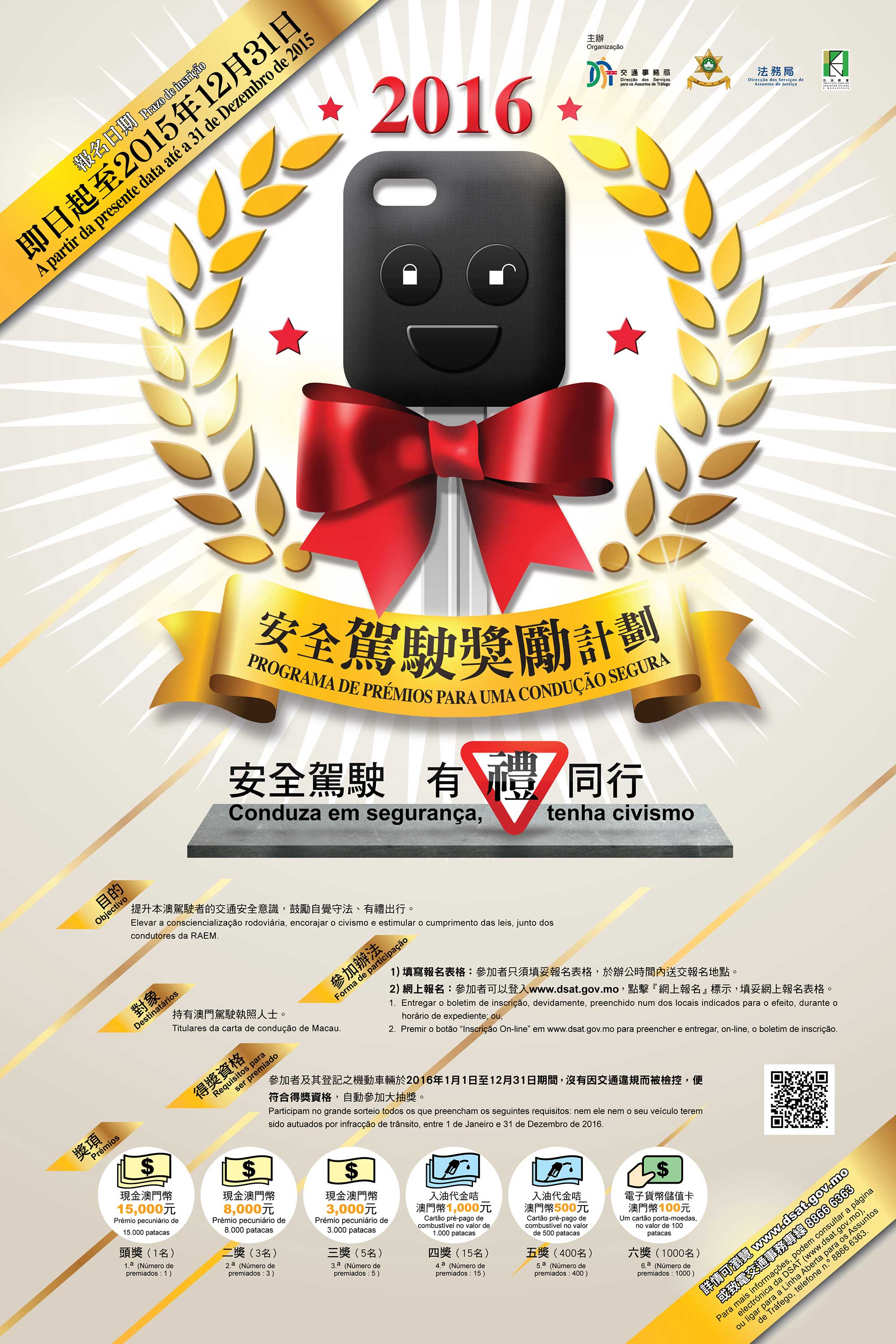 參加者及其登記之機動車輛只須於2016年1月1日至12月31日期間,沒有因交通違規而被檢控,便符合資格參加大抽獎。得獎名額共1,424個,頭獎1名可獲現金15,000元,二獎3名可獲現金8,000元,三獎5名可獲現金3,000元,四獎15名可獲入油代金咭1,000元,五獎400名可獲入油代金咭500元,六獎1,000名可獲面值澳門幣100元的電子貨幣儲值卡乙張。每名參加者可獲贈小禮品乙份,數量有限,送完即止。