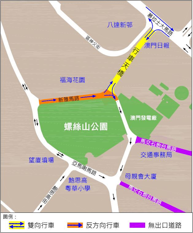 另外,本月19日(周四)上午6時至22日(周日)下午6時,新雅馬路行車天橋會改為雙向行車,介乎福海花園與新雅馬路行車天橋之間的一段新雅馬路則改作反方向通車,即車輛只可由福海花園往新雅馬路行車天橋方向行駛;而慕拉士大馬路往漁翁街方向之來車禁止右轉上新雅馬路行車天橋,慕拉士巷及涌河新巷則改為單向行車,即車輛只可由慕拉士大馬路往黑沙環海邊馬路方向行駛。其中,禁止右轉上新雅馬路行車天橋之行駛安排,將在大賽車後繼續維持,以審視有關安排是否有利於優化該處的通行。另外,本月22日(周日),新馬路節假日公交專道措施將暫停一次,當日車輛可如常行駛由龍嵩正街至營地大街之間的一段新馬路。