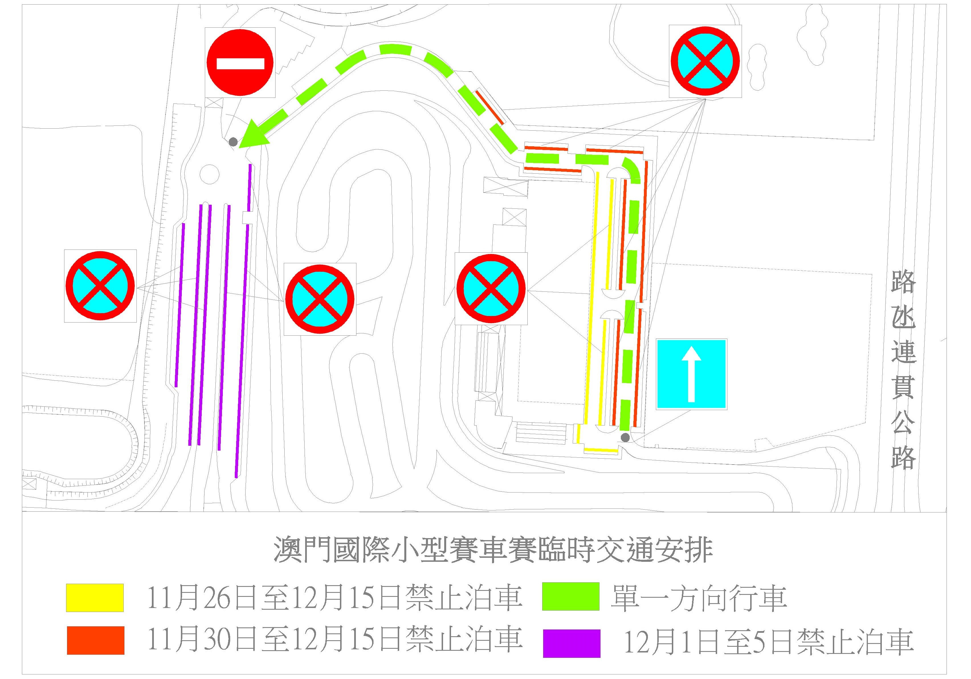 配合體育發展局舉辦澳門國際格蘭披治小型賽車錦標賽,本月26日(周四)上午9時至12月15日(周二)下午6時,路環小型賽車場內路會實施單向交通,即車輛只可由路環小型賽車場入口往高爾夫球俱樂部方向行駛,期間,該處道路的泊車位亦會分階段暫停使用。