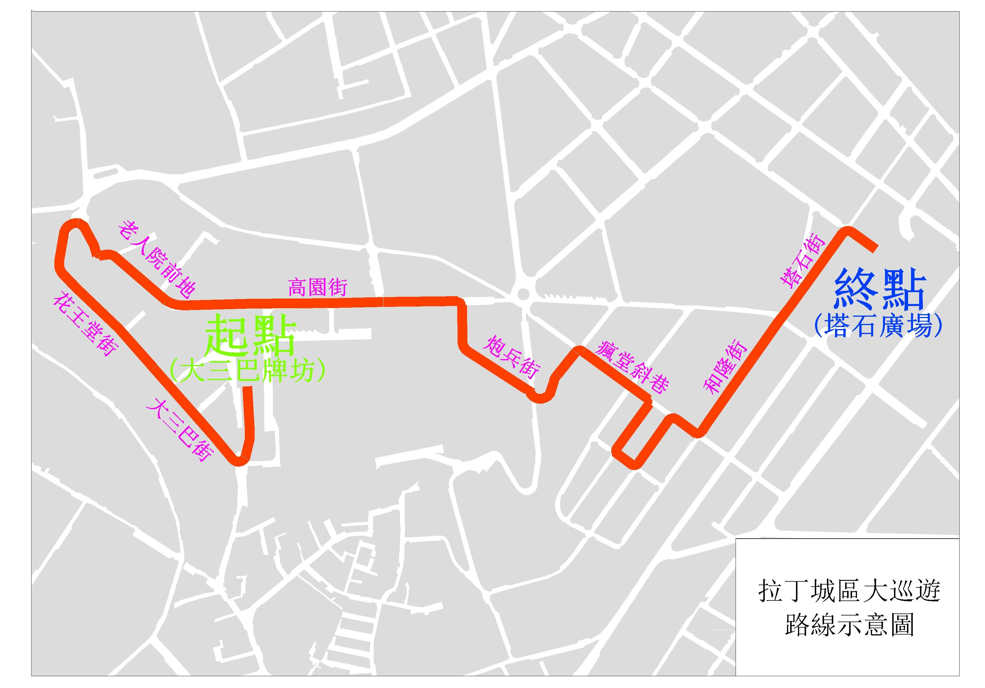 活動巡遊路線由大三巴街出發,途經花王堂街、花王堂前地、老人院前地、高園街、炮兵街、美珊枝街、瘋堂斜巷、聖祿杞街、瘋堂中斜巷、瘋堂斜巷、和隆街和塔石街,最後到達塔石廣場舉行匯演。相關道路於活動當日,即12月6日(周日)下午1時至7時會分時段封閉。同時,當日下午4時半至晚上10時半,士多鳥拜斯大馬路近高美士中葡中學之內路亦會臨時封閉交通,而當日下午3時至6時半,介乎聖美基街與瘋堂新街之間的一段瘋堂中斜巷則改為反方向行車,即車輛須由聖美基街往瘋堂新街方向行駛。此外,活動當日下午5時半至晚上10時半,士多鳥拜斯大馬路近塔石廣場的路段(即靠向舊愛都酒店一側)會增設臨時上落客點。