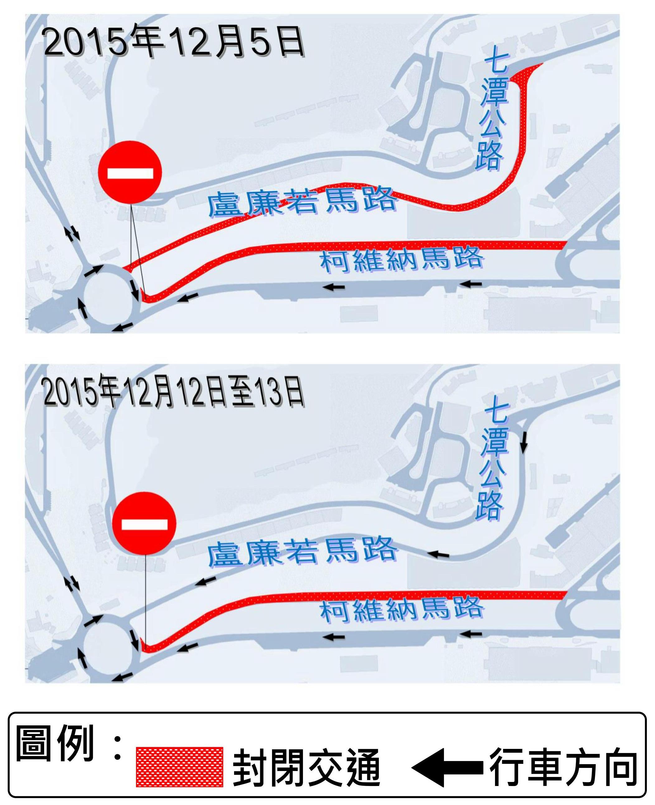 本月5日(周六),介乎七潭公路與盧伯德圓形地之間的一段盧廉若馬路封閉交通;本月5日(周六)上午8時至當日工程結束、12日(周六)上午8時起至13日(周日),介乎盧伯德圓形地與廣東大馬路之間的一段柯維納馬路(往廣東大馬路方向)同樣封閉交通,而廣東大馬路近柯維納馬路的路段則實施有限度通車,該路段部份咪錶泊車位暫停使用,屆時,11、15、26、34、35、36、MT2及MT4路線巴士須臨時改道行駛,但所有路線停靠之巴士站點則維持不變。