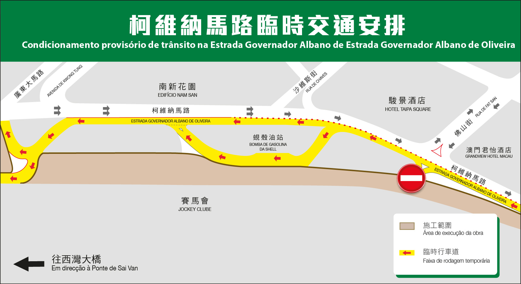 輕軌工程正持續推進市中心賽馬會路段的高架橋吊裝,為確保施工安全,周一(14日) 晚上10時起,介乎四面佛與賽馬會之間的一段柯維納馬路(往西灣大橋方向)實施封閉交通;為維持該處行車方向,施工期間靠近南新花園一側的柯維納馬路將臨時改為雙向行車。施工單位早前已開闢了臨時道路,車輛可繼續使用蜆殼油站,而右轉往廣東大馬路的臨時道路禁止車長5米以上之車輛駛入,為期約60日。