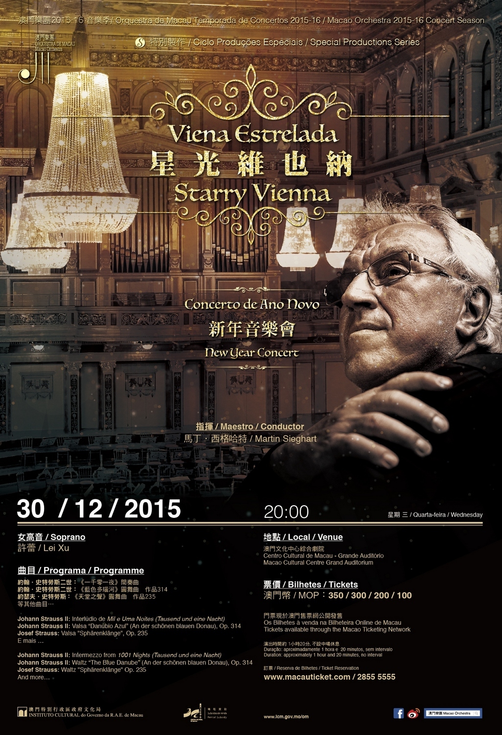 《星光維也納──新年音樂會》澳門場次僅餘少量門票,門票為澳門幣三百五十、三百、二百及一百元,已於澳門售票網公開發售並設有多種優惠。澳門售票網訂票熱線二八五五五五五五,網上訂票www.macauticket.com。詳情及節目查詢可瀏覽澳門樂團網頁www.icm.gov.mo/om。