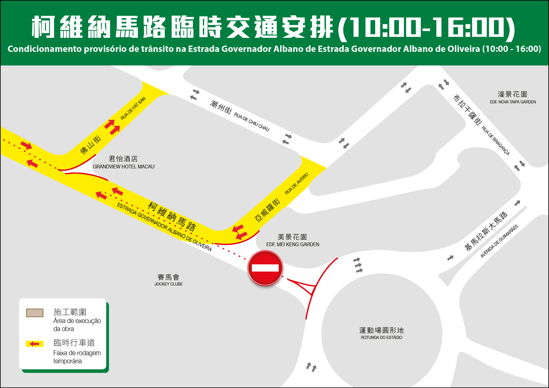 因應輕軌高架橋預製件吊裝施工,周二(12日)起,每日上午10時至下午4時,介乎氹仔亞威羅街與運動場圓形地的一段柯維納馬路實施封閉交通,往來運動場圓形地及賽馬會方向的車輛需改道行駛。運輸基建辦公室與交通事務局呼籲駕駛者留意。
