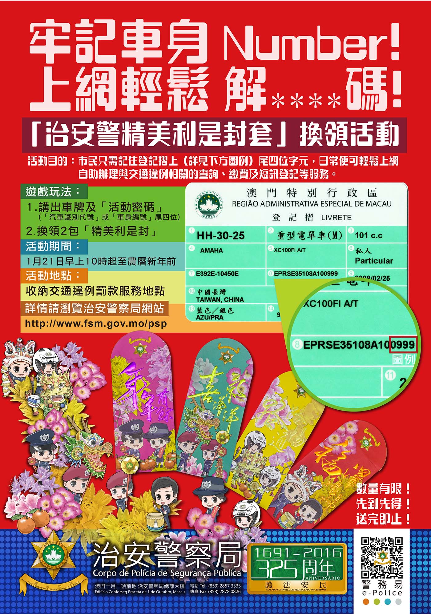 治安警察局為推動更多市民使用交通廳的網上服務,足不出戶便可辦理與交通違例相關的查詢、繳費及短訊登記等服務,特意藉推出優化便民措施的同時,舉辦以「牢記車身Number 上網輕鬆解碼」的換領利是封迎春活動。
