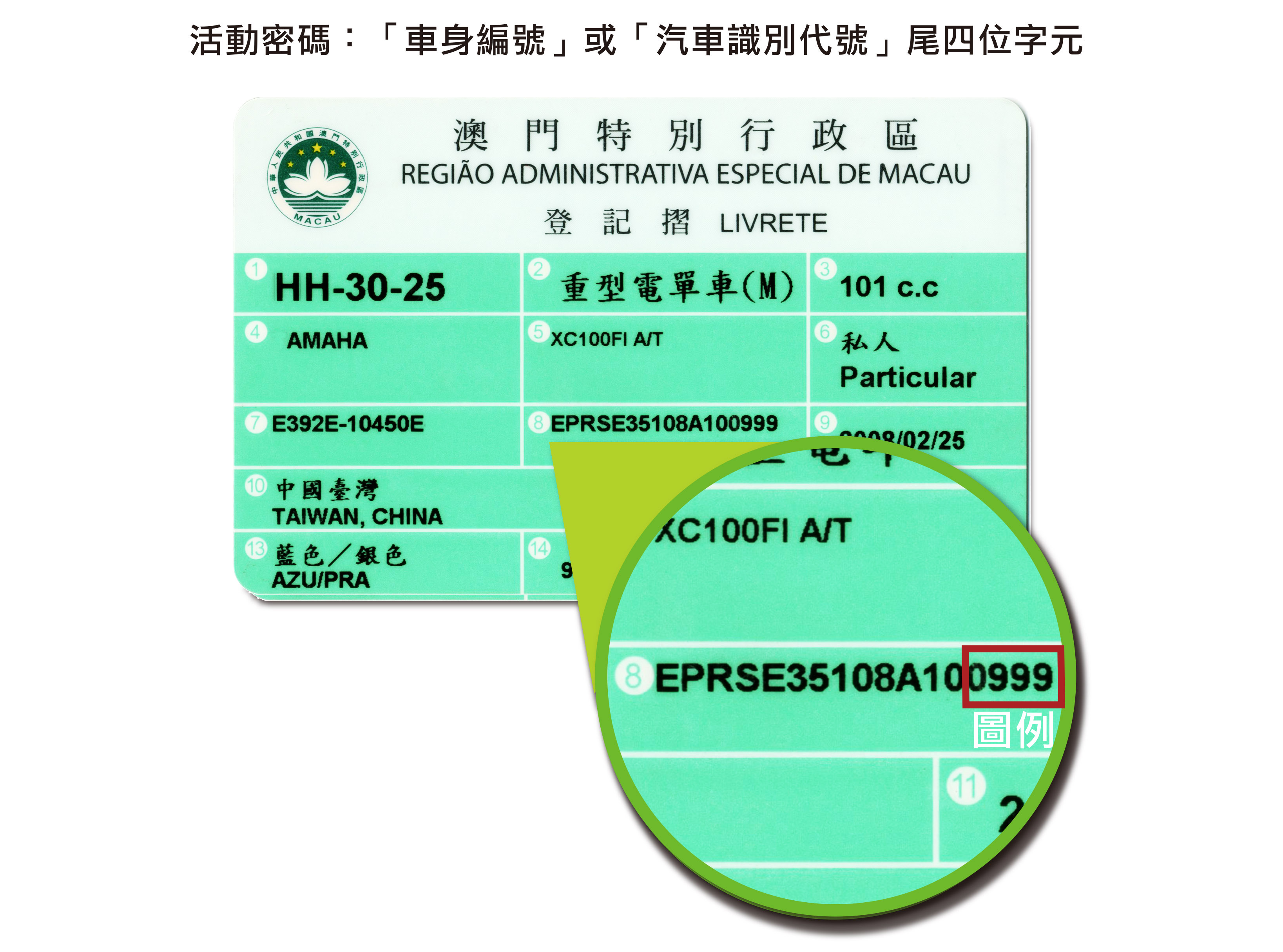 活動冀提倡市民視車輛登記摺內「車身編號」或「汽車識別代號」尾四位字元為「密碼」般記下,有助日常輕鬆上網自助辦理「交通違例短訊通知」及「交通違例查詢紀錄/繳交罰款」等服務。詳情請參閱治安警察局網站 www.fsm.gov.mo/psp