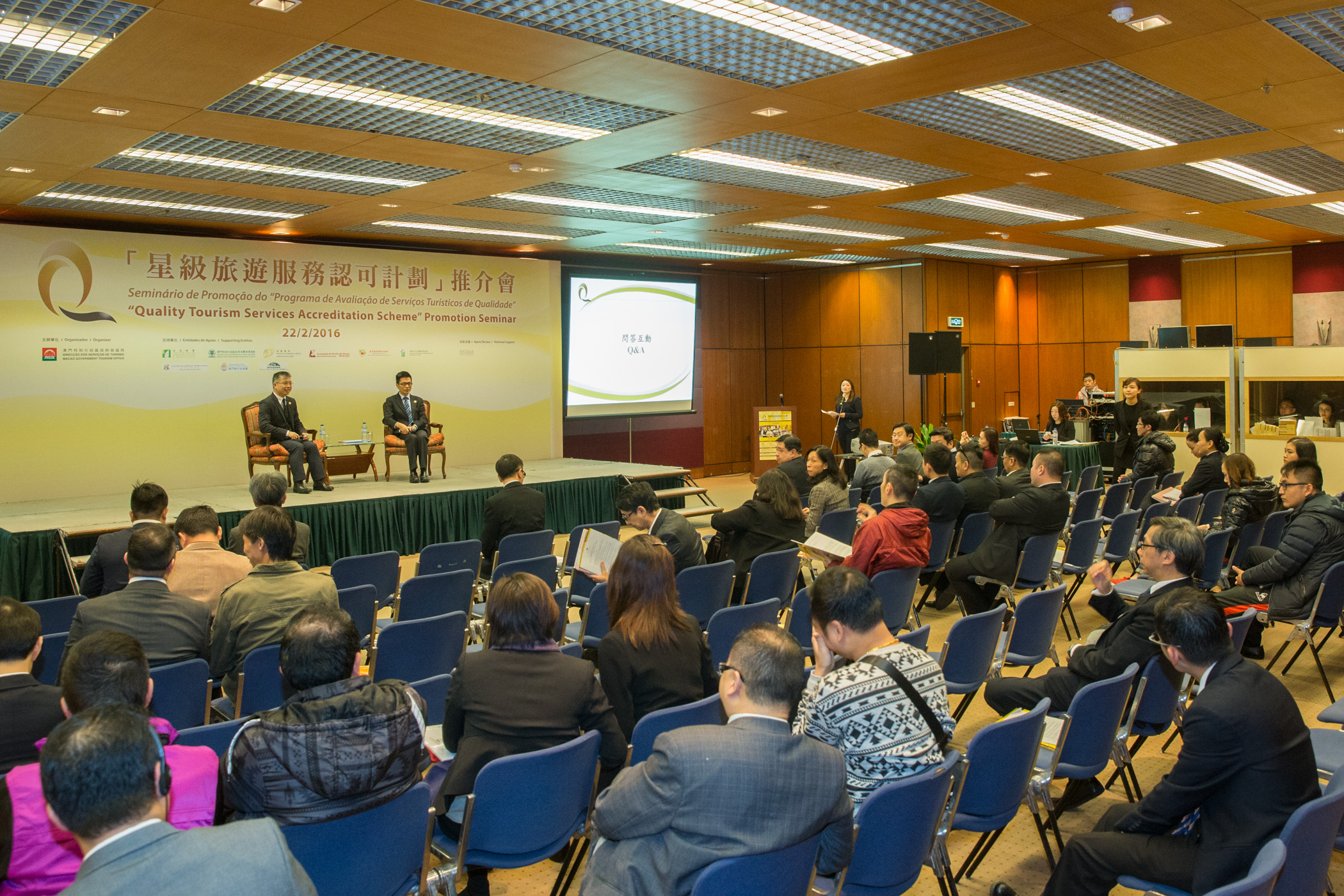 “星級旅遊服務認可計劃”推介會今(22日)於旅遊活動中心舉行,向餐飲業界介紹計劃的評審準則及申請手續。旅遊局副局長程衛東、消費者委員會執行委員會主席黃翰寧、旅遊局培訓及質量管理廳廳長梁美彩、民政總署代表湛耀宏、旅遊學院代表陳嘉適博士、香港品質保證局市場調研及分公司運營助理總監丁國滔、澳門中小型餐飲業商會副理事長劉深泉、澳門酒店協會監察長黃淑霞、澳門旅遊商會副理事長鄧嘉敏及澳門旅遊業議會副常務理事鄭耀祺等出席推介會。香港品質保證局於推介會上介紹本計劃餐飲界別的評審準則。