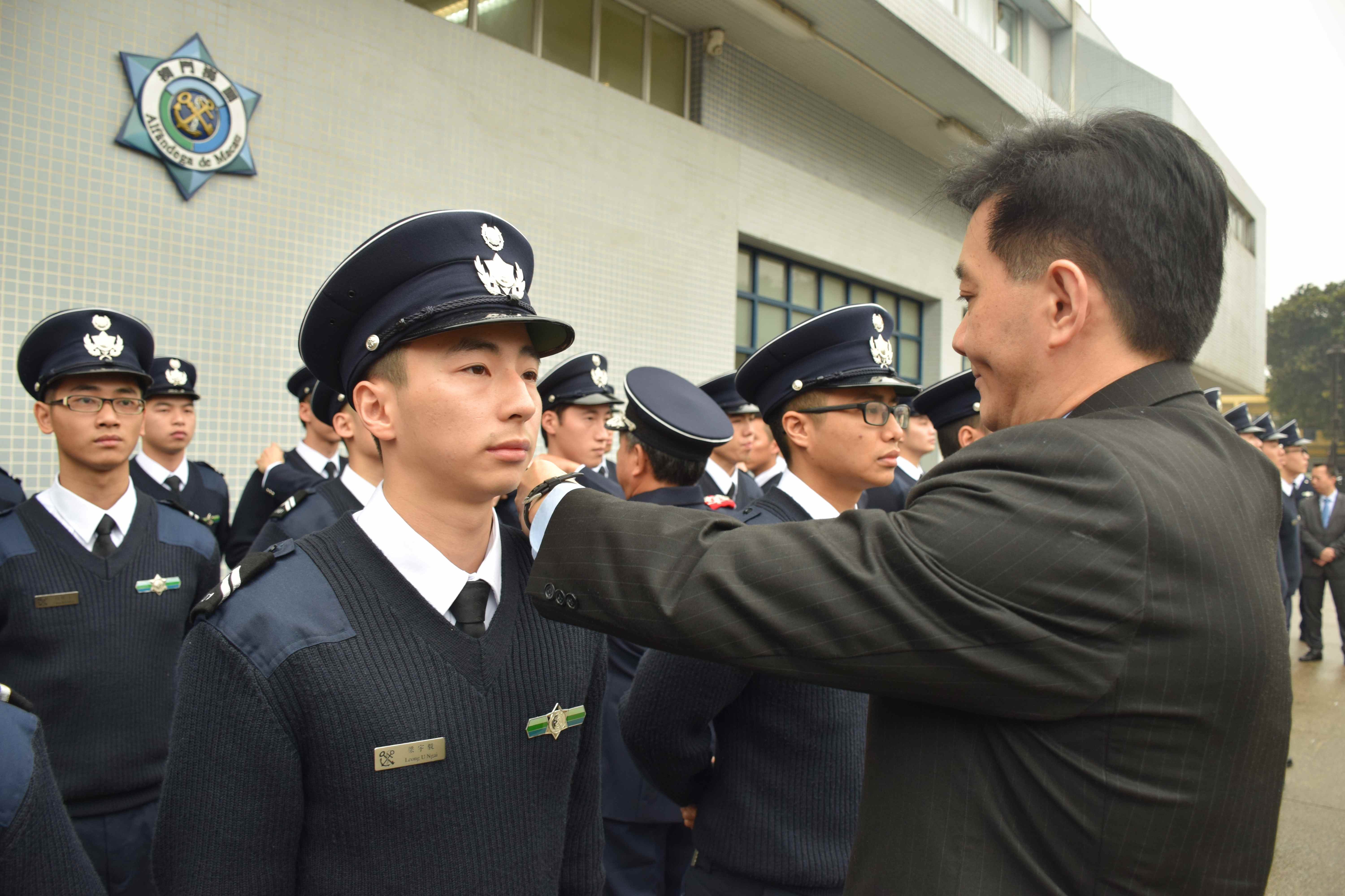 澳門海關於今日下午3時在總部舉行簡單而隆重的儀式,37名關員正式投入服務,適度緩解部門人手緊張情況。入職儀式由海關關長黃有力親自主持,本屆能夠完成九個月的培訓課程而獲得畢業的學員共37人,包括27男10女,其中關員麥翠姍獲得總成績優異獎。海關領導為入職關員戴上肩章後,關長致詞歡迎新成員加入海關團隊,同時要求關員主動學習,努力提高自身的素質,以迎接未來工作的挑戰。儀式在入職關員一眾家屬見證下進行,氣氛歡悅。其他出席儀式的官員包括冼桓球副關長、吳國慶助理關長、黃國松助理關長以及各部門主管。
