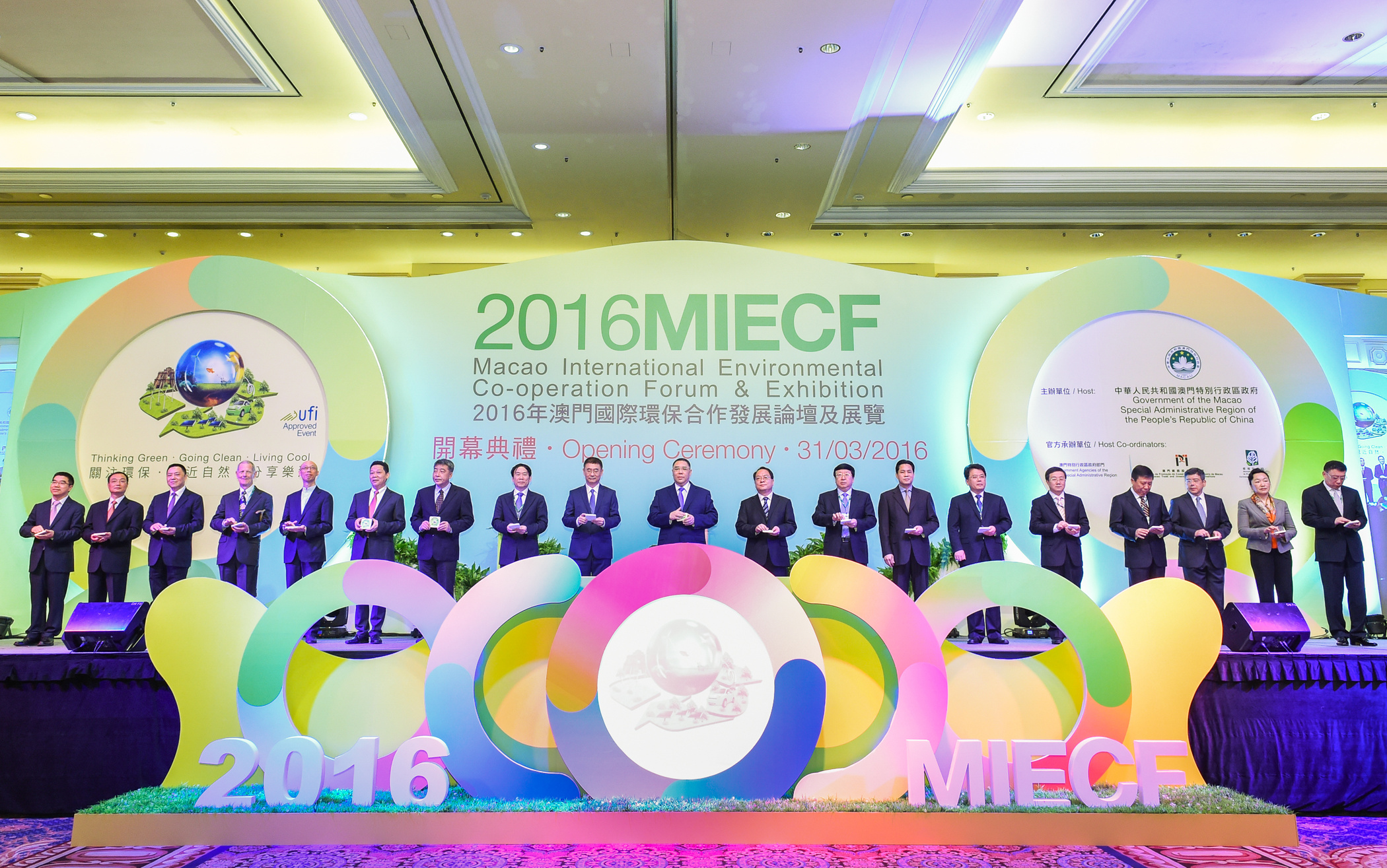 2016 MIECF於今日上午十時舉行開幕典禮,澳門特別行政區行政長官崔世安、中央人民政府駐澳門特別行政區聯絡辦公室副主任姚堅、外交部駐澳門特別行政區特派員公署副特派員潘雲東、國家科學技術部副部長徐南平、湖南省人民政府常務副省長陳向群、廣東省人民政府副省長許瑞生、廣西壯族自治區人民政府副主席黃世勇、四川省人民政府副省長楊興平、雲南省人民政府副省長劉慧晏、香港特別行政區環境局局長黃錦星、國家發展和改革委員會徐紹史主任代表、資源節約和環境保護司副司長呂文斌,循環經濟先行者、“從搖籃到搖籃”及“績效經濟”概念始創人、 日內瓦產品生命研究所創辦人、羅馬學會正式成員瓦爾特•施塔爾教授,國家環境保護部陳吉寧部長特別代表 、辦公廳副主任陳燕平,澳門特別行政區經濟財政司司長梁維特、澳門特別行政區運輸工務司司長羅立文、江西省人民政府副秘書長謝茂林、福建省人民政府環境保護廳廳長朱華、海南省人民政府生態環境保護廳廳長鄧小剛以及貴州省人民政府環境保護廳副廳長徐恒主禮。