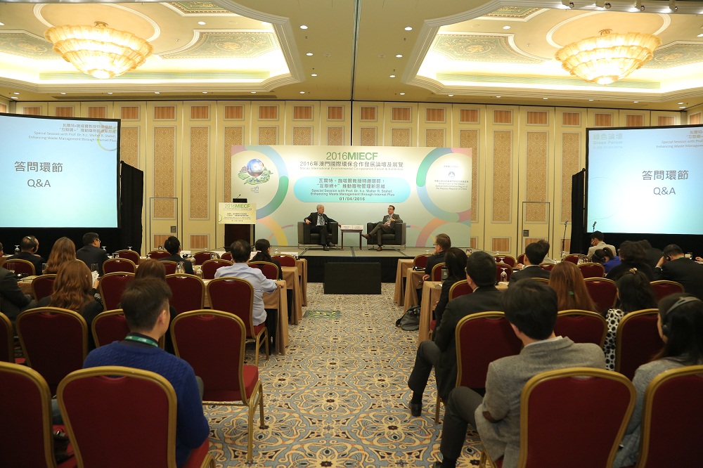綠色論壇方面,今屆MIECF因應現今企業日益關注如何以對環境無害化的方式處置廢棄物,故以“廢物管理”為論壇主題,共舉行了6場論壇環節,以及一場特邀專家環節,來自11個國家及地區46位專家學者、環保先鋒、環保跨國企業領袖及區域政策制定者就“廢物管理”、“源頭減廢”、“轉廢為寶”、“化工固廢”、綠色酒店及建築等熱門綠色經濟議題作深入探討,分享各地區在廢物管理和再生產的經濟,共同推動再利用和減少廢物的產生。其中更邀請了循環經濟先行者、“從搖籃到搖籃”及“績效經濟”概念始創人、日內瓦產品生命研究所創辦人、羅馬學位正式成員瓦爾特・施塔爾教授(Professor Dr. h.c. Walter R. Stahel)任主旨發言嘉賓,並舉辦了一場特邀環節:“‘互聯網+’推動廢物管理新思維”。