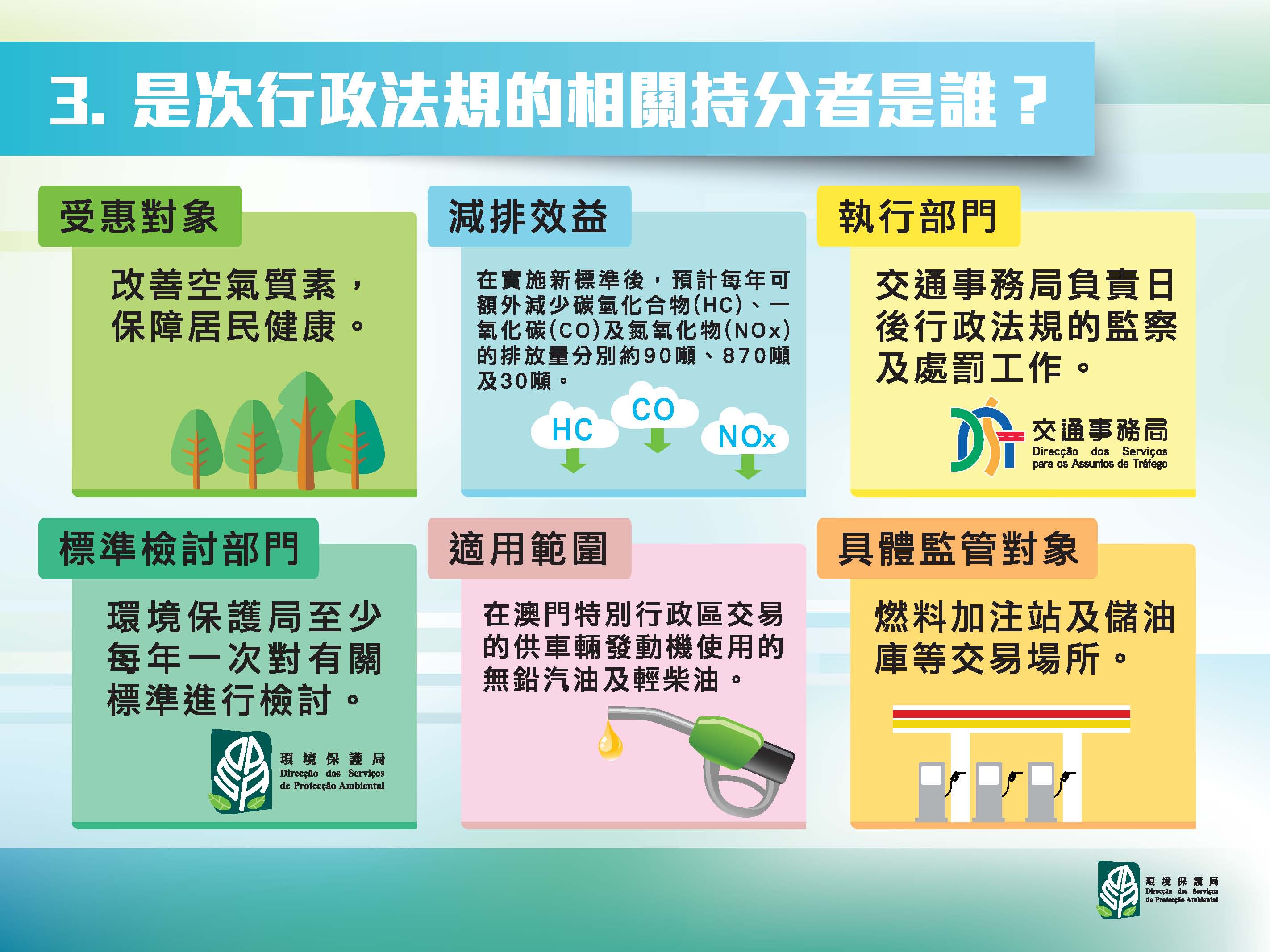 特區政府已於2016年6月13日公佈第15/2016號行政法規《車用無鉛汽油及輕柴油標準》,規定在澳門交易的車用無鉛汽油和輕柴油須符合相當於歐盟V期的車用燃料標準,上述行政法規自公佈後滿三十日起生效,在一百八十日過渡期內,有關車用無鉛汽油及輕柴油亦須符合法規規定的過渡標準。藉此進一步減少車輛尾氣造成的空氣污染,從而更好地保障環境質素和居民健康。