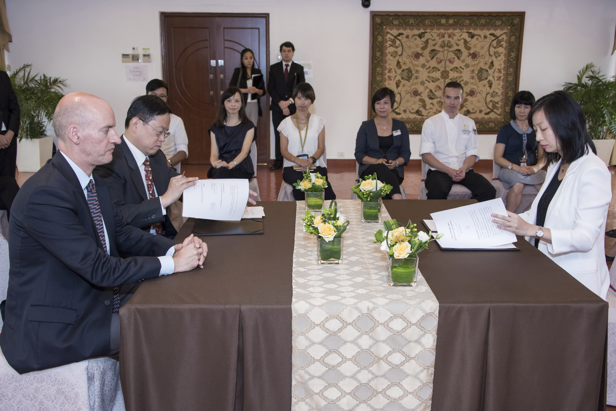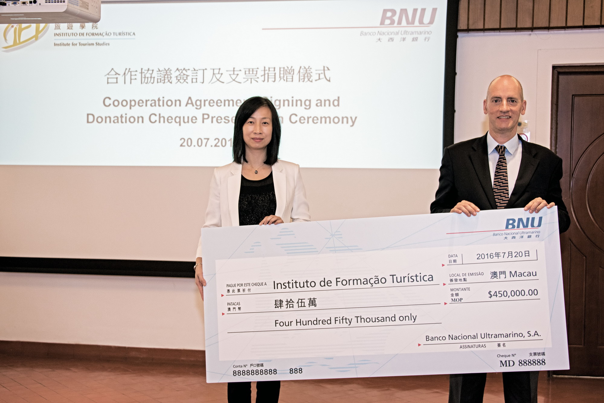 大西洋銀行捐出澳門幣四十五萬元予旅遊學院作獎學金,捐贈儀式由旅遊學院院長黃竹君博士及大西洋銀行行政總裁郭冠樑先生主持。