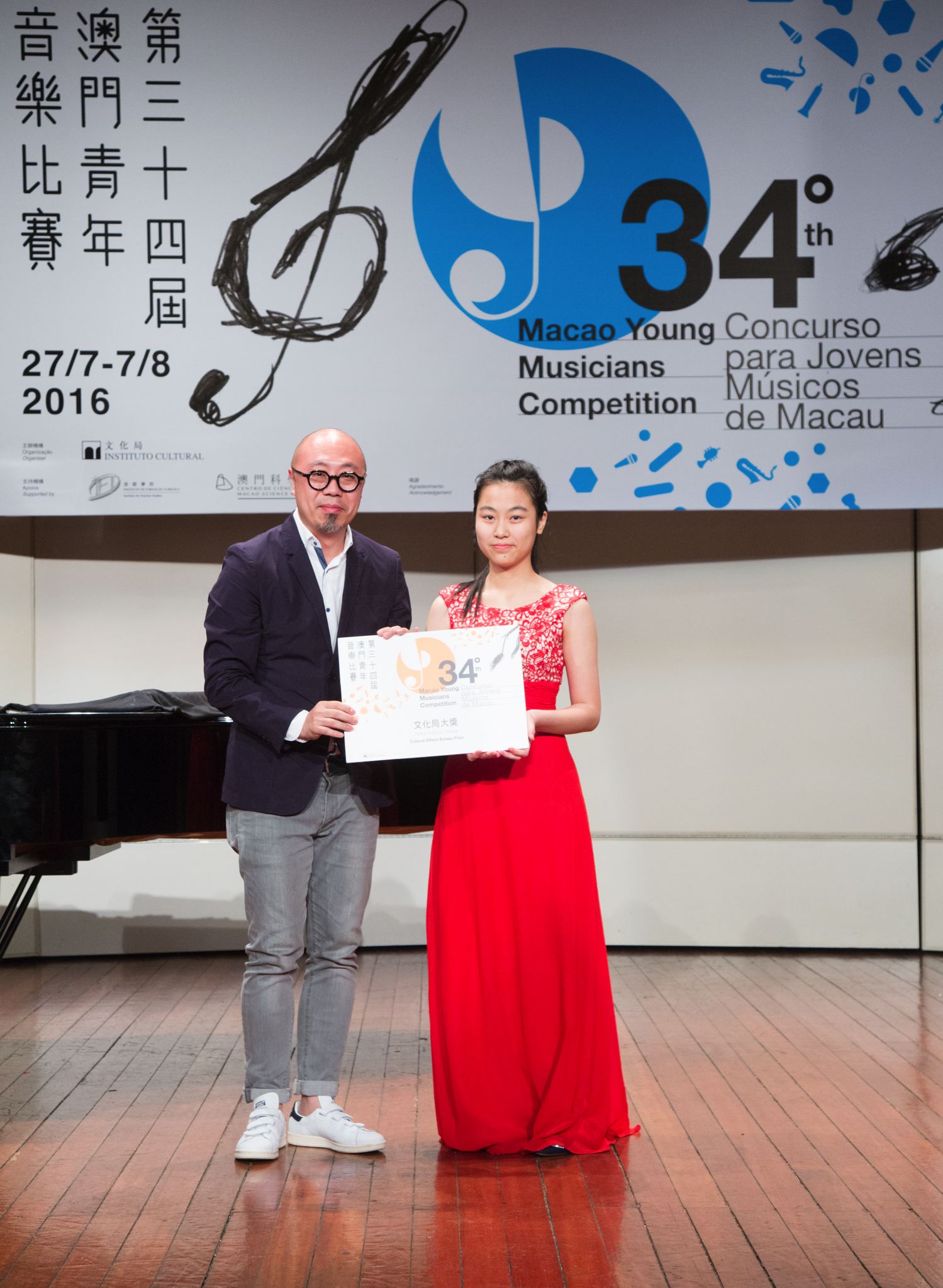 文化局大奬得主蕭麗娜為本屆青音比賽古箏高級組賽事冠軍,現年十六歲,曾榮獲第二十六屆澳門青年音樂比賽古箏初級組第一名、第三十屆古箏高級組第二名、中國小金鐘全國總決賽金獎等多個獎項,並取得中國民族管弦學會考級十級優秀的成績。蕭麗娜自五歲起於澳門文化藝術教育中心隨袁泉學習古箏,二零一三年起加入澳門青年古箏藝術團,師隨王健偉,二零一四年起師從著名古箏演奏家周茜。比賽中蕭麗娜演奏完整、音色細膩、充滿自信,具有舞台表演的特質,獲評審好評。蕭麗娜將獲頒由主辦單位文化局提供的獎學金,作為修讀音樂相關之大學本科或其先修班課程的首年學費之用。