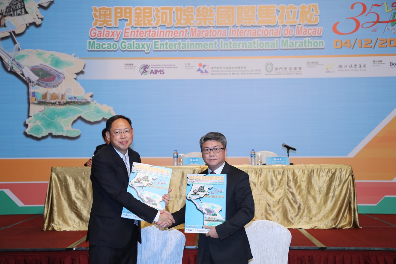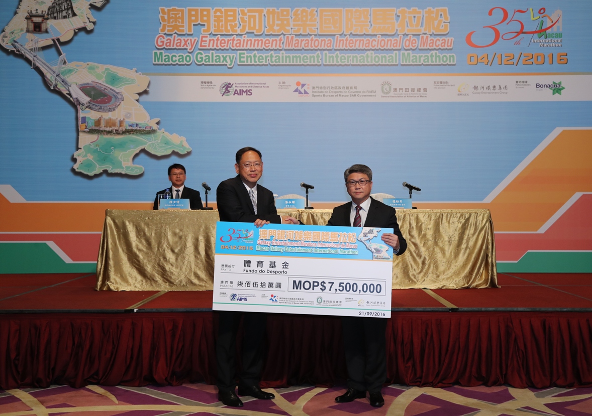 今天的簽署儀式上,體育局局長潘永權及銀河娛樂集團董事程裕昇共同簽署了澳門國際馬拉松2016至2018年賽事的冠名贊助協議書。銀河娛樂集團將由今年開始至2018年,再次成為本賽事的冠名贊助商,並向賽事每年贊助澳門幣二百五十萬元正,三年的總贊助金額合共澳門幣七百五十萬元正。