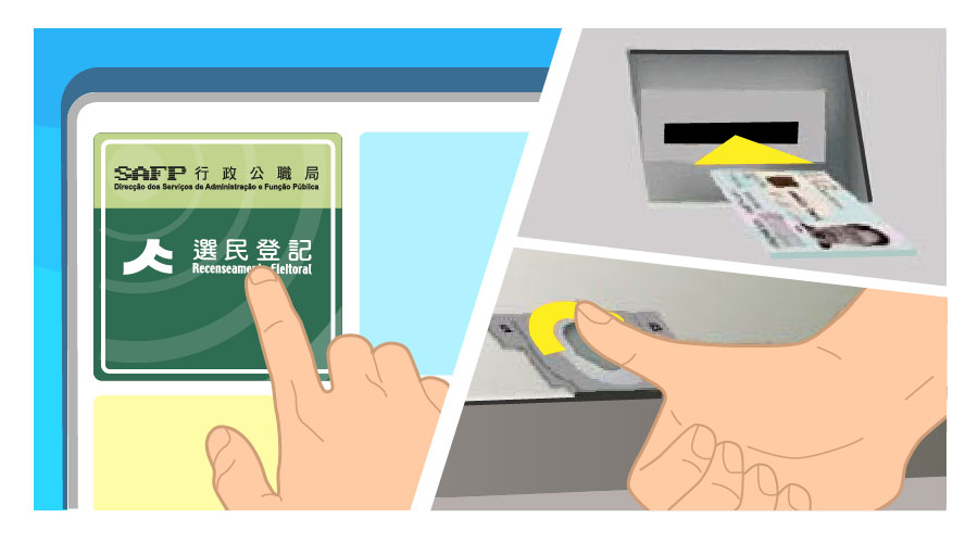 合資格而未登記人士可於自助服務機中點選“選民登記”服務辦理選民登記,按指示將本人的澳門永久性居民身份證插入自助服務機的指定位置,經指紋核實身份,便可輕鬆完成選民登記手續;已登記選民亦可利用自助服務機更改資料。行政公職局提醒市民,掃瞄身份證影像時請待掃瞄完成方取回身份證,確保身份證影像完整上載。