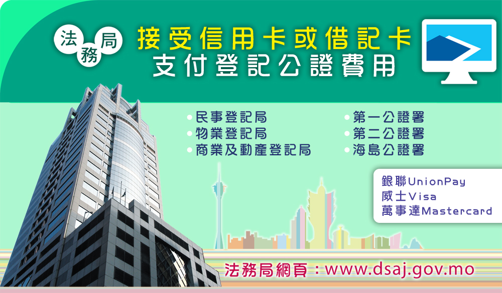 市民到第一公證署、第二公證署、海島公證署、民事登記局、物業登記局、商業及動產登記局及政府綜合服務大樓辦理登記公證服務,均可憑銀行發出的信用卡或借記卡(銀聯UnionPay、威士Visa或萬事達Mastercard)支付金額為澳門幣三百元至澳門幣五萬元的登記或公證費用,但不包括透過一站式服務所收取的登記費用,以及協助其他部門代收的費用。