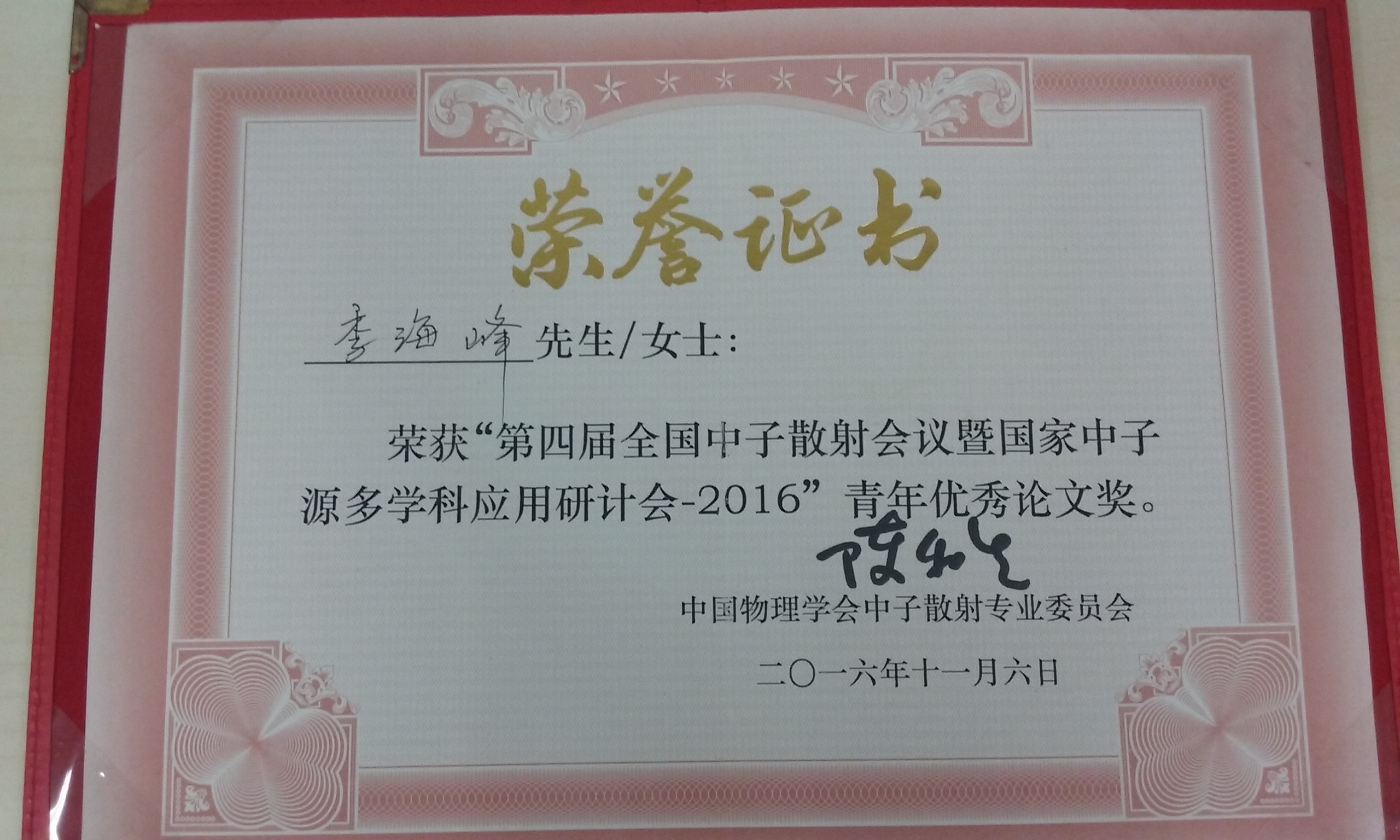 李海峰的中子及同步輻射衍射研究揭示了鉻酸鹽中新奇多鐵性能的起源以及其磁性的本質,該研究解決了長期存在於鉻酸鹽中的科學難題,推動了鉻酸鹽的潛在應用開發研究。該研究深受中子散射專業委員會及相關專家學者的青睞,並於研討會上獲頒傑“青年優秀論文獎",以表彰其在中子散射研究領域所作出的積極貢獻。