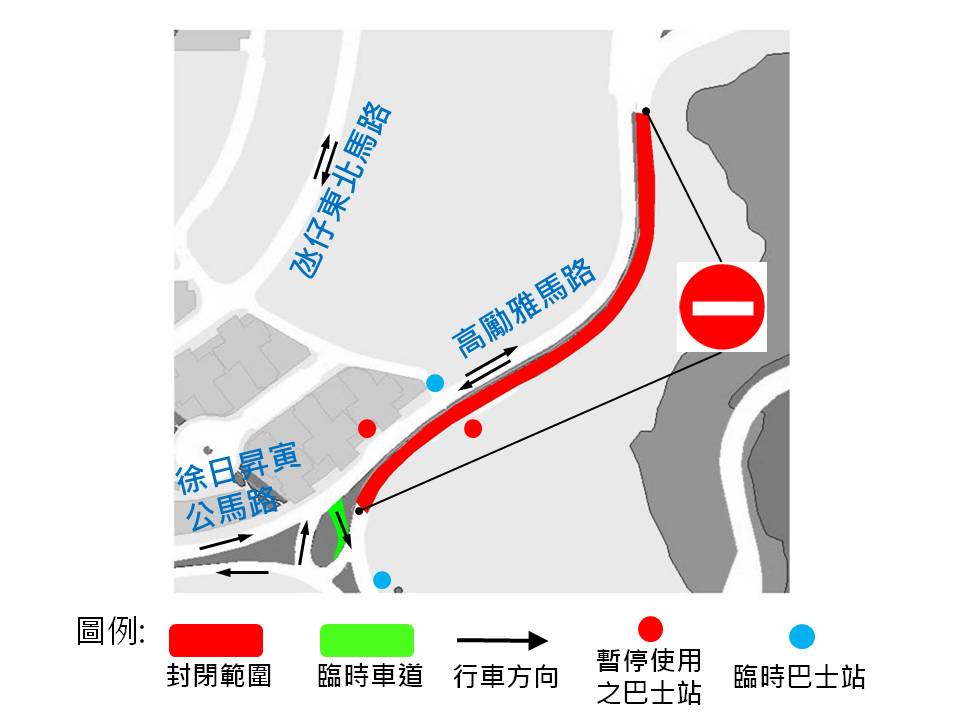 配合土地工務運輸局繼續進行下水道工程,11月19日(周六)上午10時起,介乎信安馬路與徐日昇寅公馬路的一段高勵雅馬路實施臨時交通安排,當中往徐日昇寅公馬路方向的行車道會臨時封閉,而往友誼大橋方向的行車道會改為雙向行車,為期150日。期間,“海灣花園"站將往雞頸馬路方向臨時遷移約150米,“高勵雅馬路"站則往友誼大橋方向臨時遷移約50米,呼籲使用上述巴士站的乘客留意。