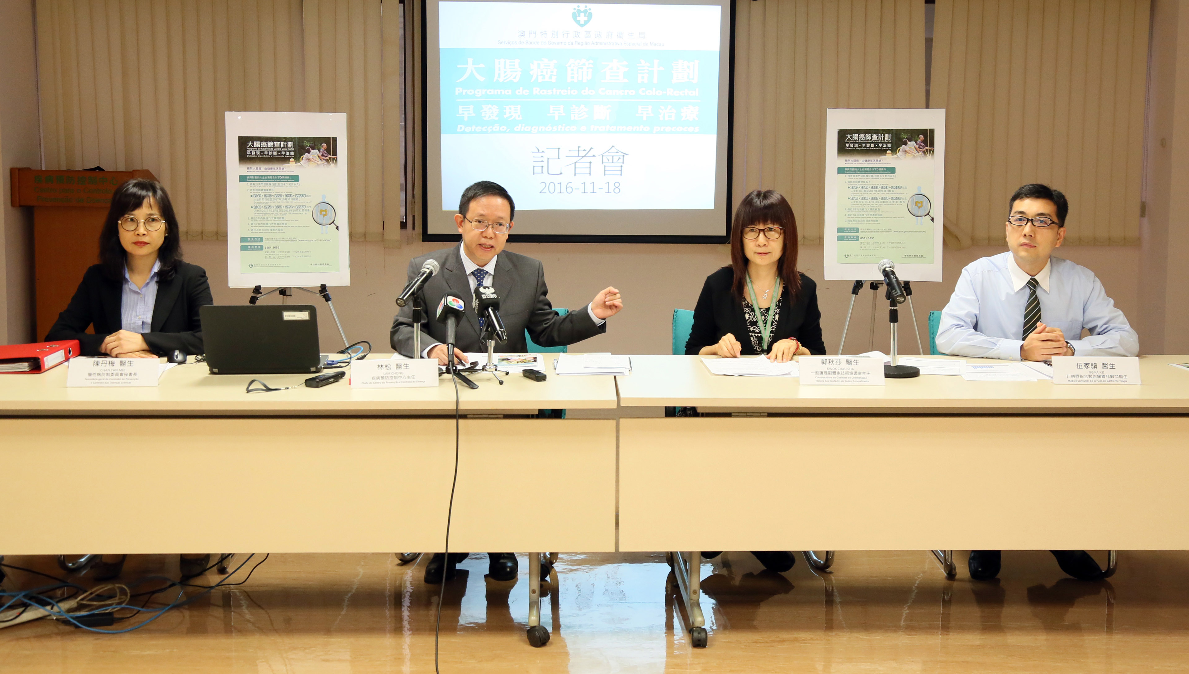 衛生局於11月18日召開記者會介紹「大腸癌篩查計劃」,疾病預防控制中心主任林松、慢性病防制委員會秘書長陳丹梅、一般護理副體系技術協調室主任郭秋莎和仁伯爵綜合醫院腸胃科顧問醫生伍家驥出席。