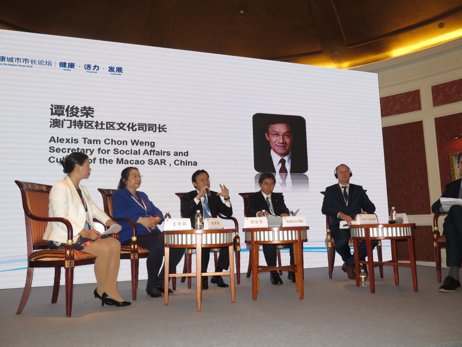 在大會以“健康老齡化與城市未來”為主題的平行會議上,譚俊榮司長作為座談嘉賓與各國代表交流分享。他介紹,特區政府致力為長者構建長遠而全面的養老保障體系,通過制定《養老保障機制及長者服務十年行動計劃》,成立養老保障機制跨部門策導小組,持續優化和發展“醫社服務”、“權益保障”、“社會參與”和“生活環境”四大範疇的長者服務,著力促進個人、家庭、社區、政府和民間機構的共同協作,全面應對人口老齡化的挑戰。他並分享了特區政府設立老人保健門診和住院病區、成立老人科,推行長者健康支援、實施出院計劃、社區家居護理,以及新設立跨部門合作的失智症診療中心等成功舉措,強調澳門將繼續關注人口老齡化的數據變化和發展趨勢,及時調整策略,構建更適切本地需要的養老保健體系。