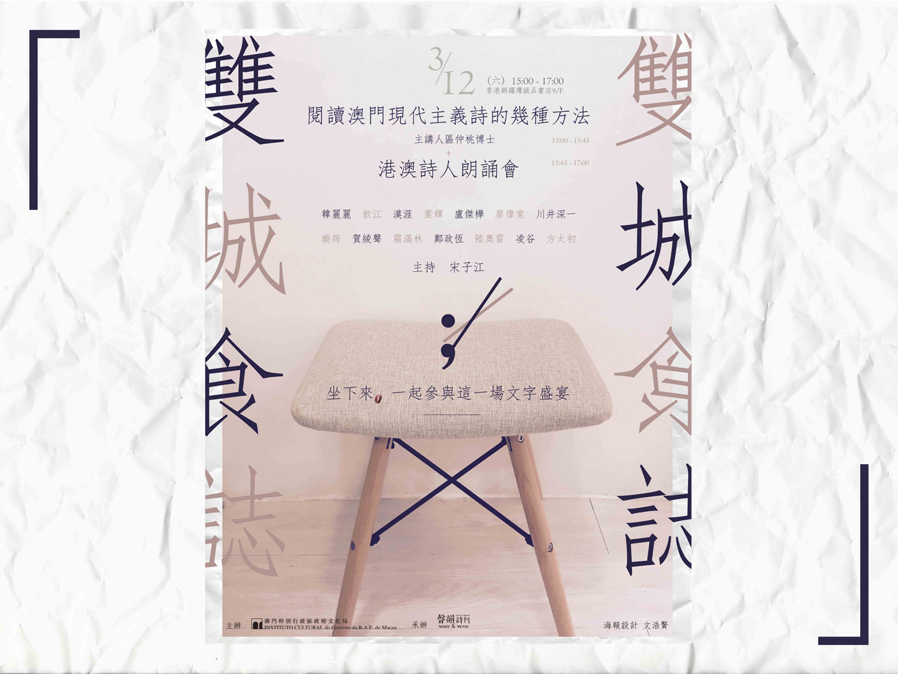 為加深外地讀者對澳門詩歌發展的認識,加強澳門與香港兩地詩人的互動交流,由文化局主辦、香港《聲韻詩刊》承辦的“閱讀澳門現代主義詩的幾種方法” 詩歌講座及“雙城食誌——港澳詩人朗誦會”,將於下周六(十二月三日)下午三時至五時於香港銅鑼灣誠品書店九樓“誠品講堂”舉行,活動費用全免,歡迎市民參與。