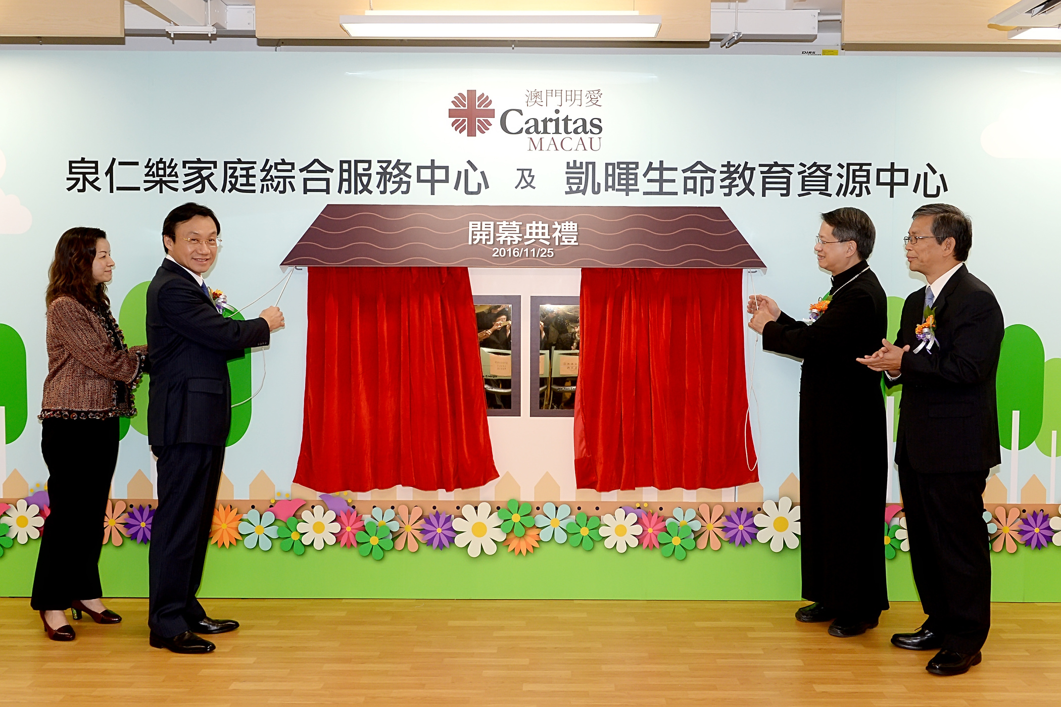 譚俊榮司長在澳門教區李斌生主教、明愛潘志明總幹事及社會工作局黃艷梅局長的陪同下主持兩所中心的揭幕儀式,並聯同中聯辦社會工作部趙維平處長、澳門明愛袁志海服務總監,以及服務使用者代表陳燕周女士共同主持剪綵儀式。
