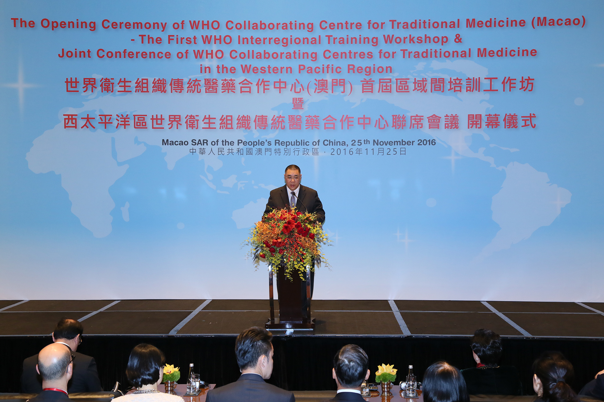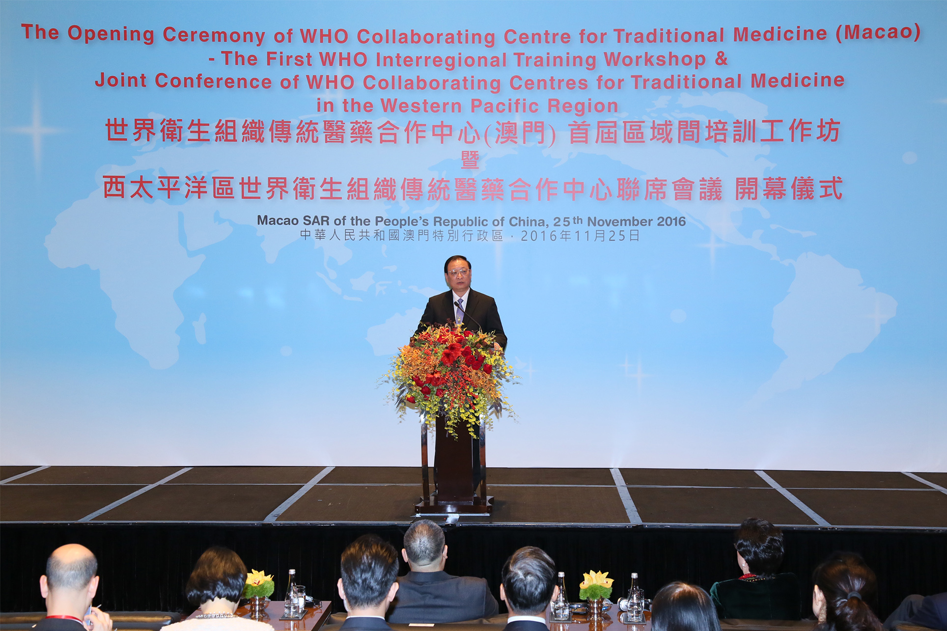 澳門特別行政區行政長官崔世安博士在開幕式致辭中表示,中醫藥在澳門有悠久的歷史,特區政府重視中醫藥的傳承與發展,尤其關注中醫藥的規範化管理,致力完善中醫藥的監管系統,持續優化藥物監管機制。此外,特區政府亦將中醫藥產業化作為促進經濟適度多元發展的重要手段,促進澳門產業結構的調整。他提及澳門與廣東省共同在橫琴建設中醫藥科技產業園,能充分發揮澳門連接葡語國家的橋樑作用,推動澳門中醫藥產業化和國際化。特區政府還將配合中央政府對“一帶一路”的戰略規劃,加強與沿線國家在傳統醫藥領域的合作,積極參與中醫藥的建設發展。他指出,世衛傳統醫藥合作中心(澳門)的設立代表著國際對澳門傳統醫藥發展的認可,也是國家以至世界對未來澳門中醫藥發展的期望與要求。他表示特區政府會在推廣有效和安全使用中醫藥的過程中,承擔應有的責任,讓更多人接納和珍視包括中醫藥在內所有傳統醫藥的價值。