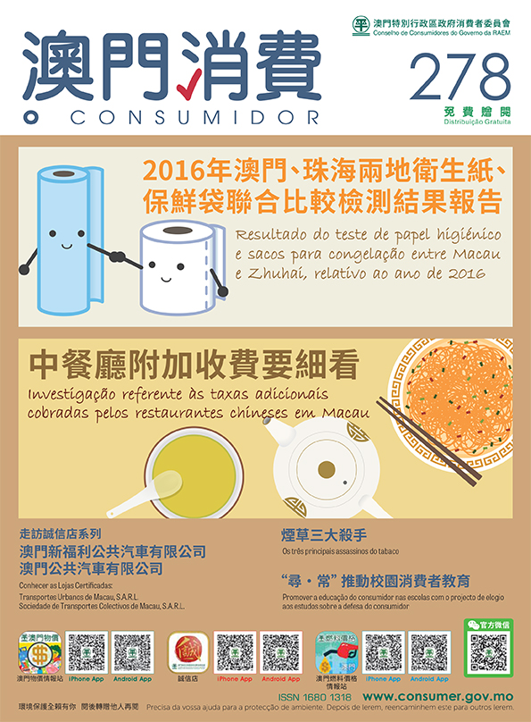 消委會出版的第278期《澳門消費》公佈澳、珠兩地的衛生紙與保鮮紙聯合抽查報告,以及本澳中餐廳收取各項附加費的規定與收費標準的問卷調查結果,消費者可參加最新一期《澳門消費》查閱該兩份報告的詳細內容。