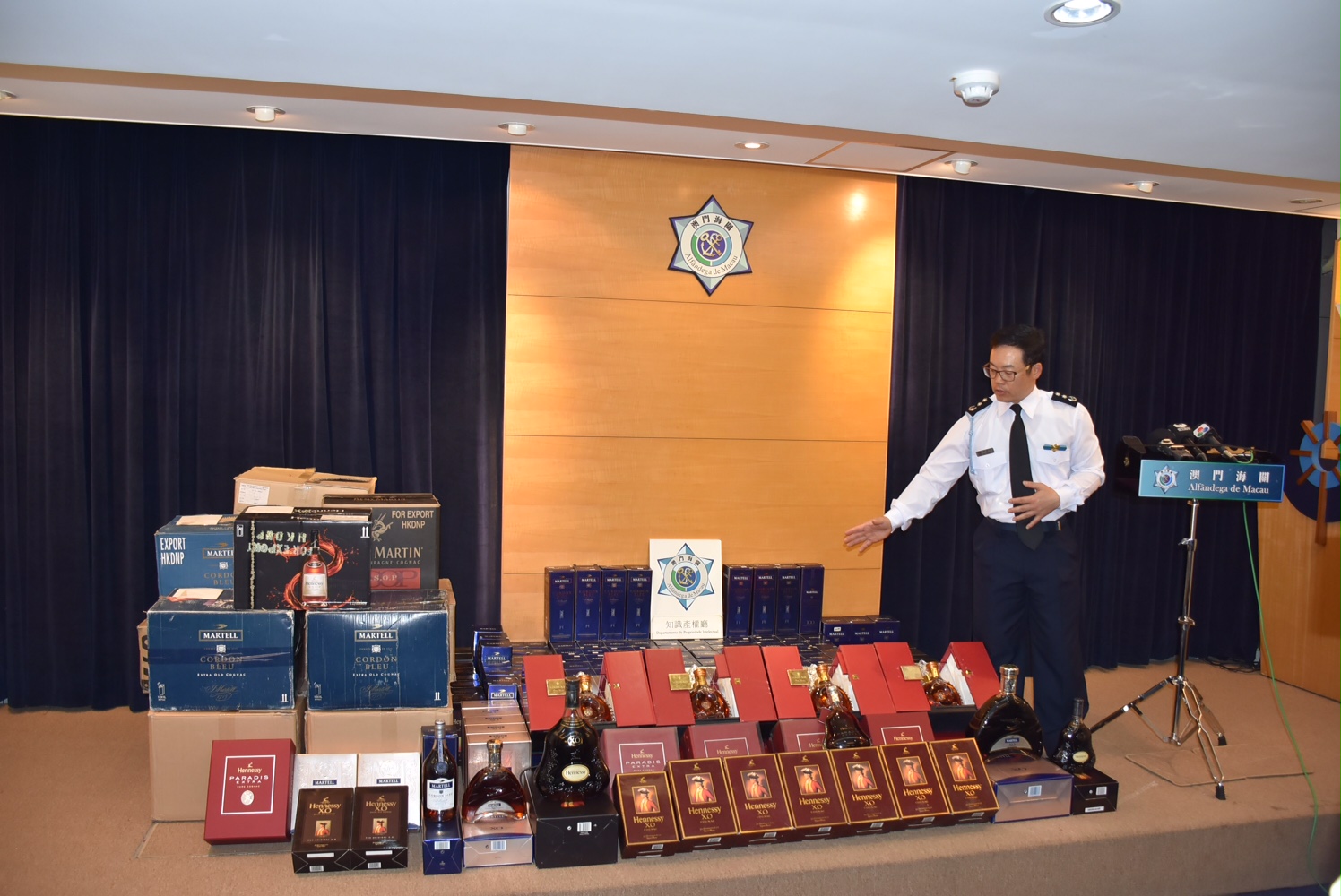 本月五日,澳門海關知識產權廳監檢處關員帶同品牌鑑定人,向目標店舖採取行動。在品牌權利人協助下,即場對該店舖所出售的洋酒作出鑑定,發現部分為冒牌產品,海關關員同時發現該店玻璃櫃內展示六瓶冒牌洋酒,根據資料追查出供貨地點,再於供貨地點查獲冒牌洋酒。經鑑定專家即場鑑定,是次行動中所查獲的「HENNESSY」、「MARTELL」及「LUIS XIII」合共一百七十四瓶洋酒,均為贗品。涉案店舖負責人一名姓楊,三十四歲,持澳門非永久性居民身份證;另一名負責人姓歐,五十九歲,持澳門永久性居民身份證,兩人均為男性。