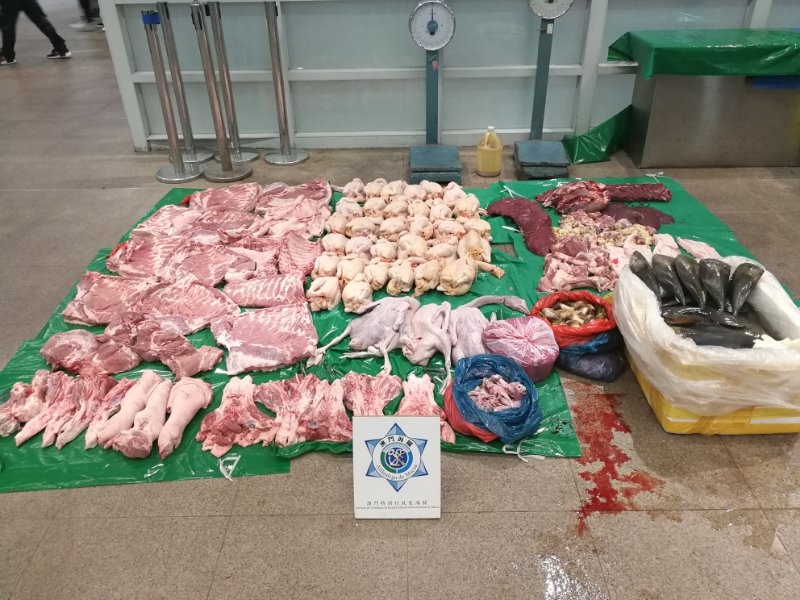 海關聯同民署食品安全中心執法人員,昨日(4日)早上在澳門北區一帶巡查時,查獲一宗涉嫌銷售及走私未經檢疫鮮活食品的案件,在涉案貨車上查獲35隻已宰禽鳥共重62.5公斤、3公斤禽鳥內臟、96公斤豬肉、7公斤豬內臟、20公斤牛肉、32公斤貝殼類及4公斤蛙類,緝獲物共重224.5公斤。海關將涉案人帶回總部協助調查,並以行政違法作出檢控。