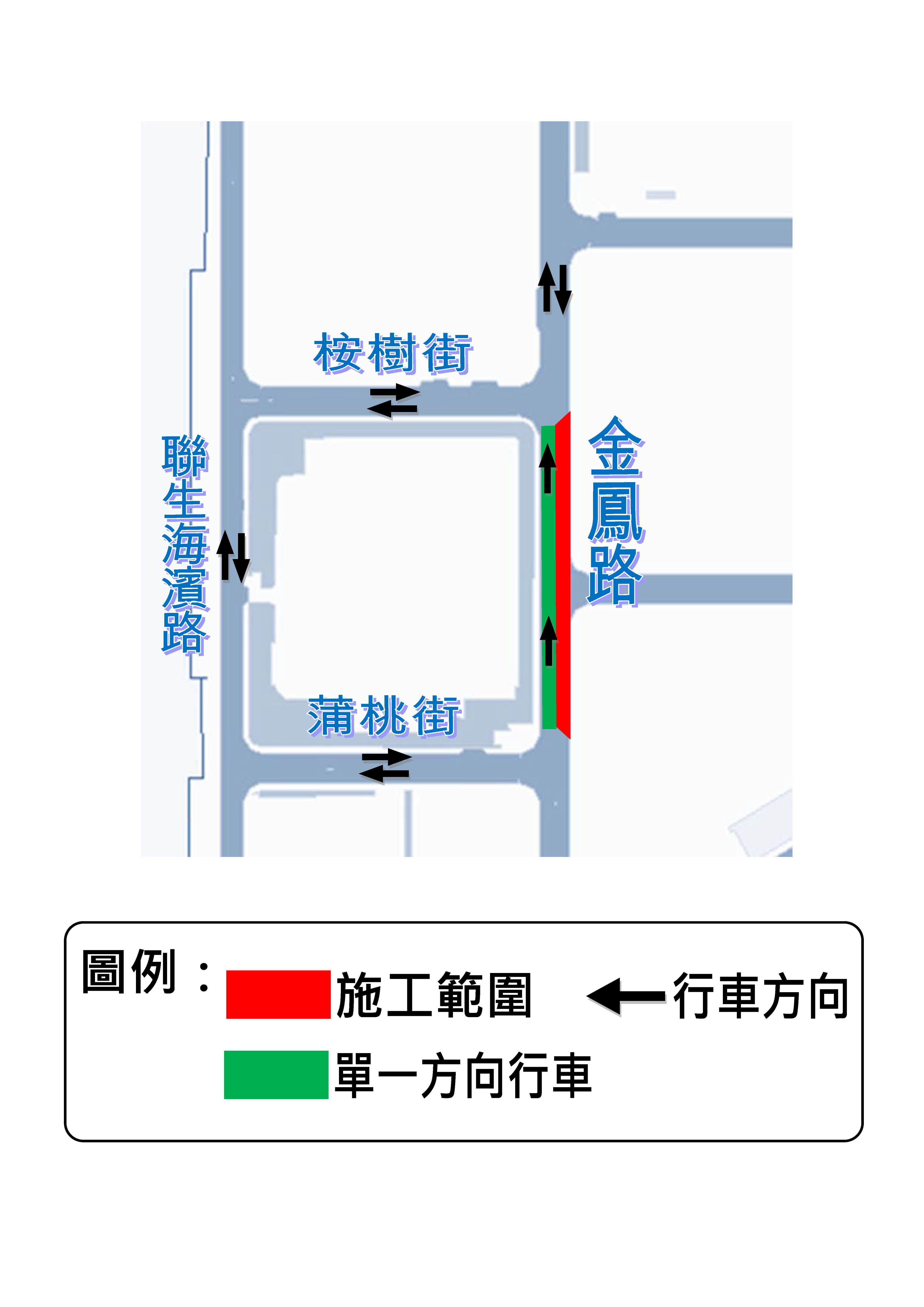 因接駁街渠,於3月15日(周三)至4月2日(周日)期間,介乎桉樹街至蒲桃街之間的一段路環金鳳路實施單一方向行車,車輛只可由聯生圓形地往樟樹街方向行駛,而前往聯生圓形地之車輛可取道桉樹街、聯生海濱路及蒲桃街。工程期間,設於該處之重型車輛泊車位會暫停使用,紅(木何)路近松樹街的路段亦會實施有限度通車。