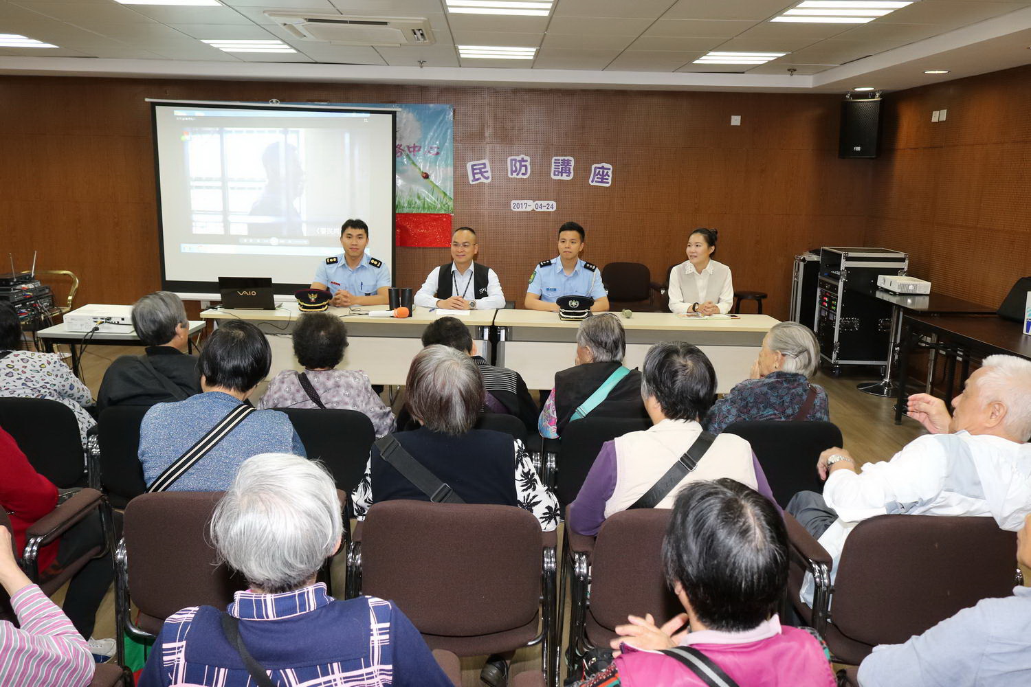 是次宣傳活動於2017年4月24日(一)上下午,先後在澳門及路氹一帶社區進行。宣傳隊由何樹漢副警務總長帶領,首先抵達坊會與居民會面,由部門代表講解颱風期間的安全要領,播放民防宣傳短片,提醒多加留意人身、家居、店鋪等方面的安全,以提高預防及抗擊颱風災害的能力。居民主動與代表交換意見,互動氣氛良好。隨後,一行人與義工聯合到區內派發宣傳單張,向居民傳遞民防資訊。