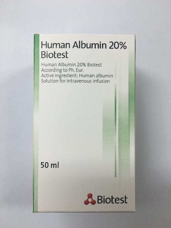 根據香港衛生署的通報,由德國Biotest Pharma Gmbh所生產,批號為B235174、B225065及B234026、用於治療低血漿量及低血白蛋白症的處方藥物 “Human Albumin "Biotest" Infusion 20% 50mL”,由於發現藥物在製造過程中可能被製造儀器的冷卻液污染,因此,該生產商自願回收相關批次藥物。