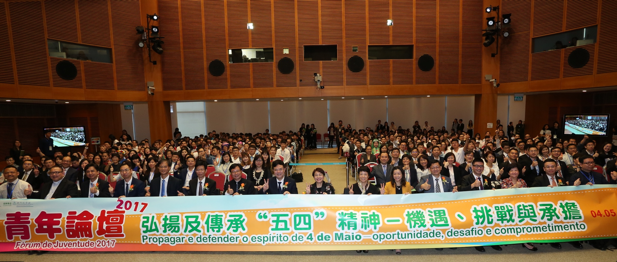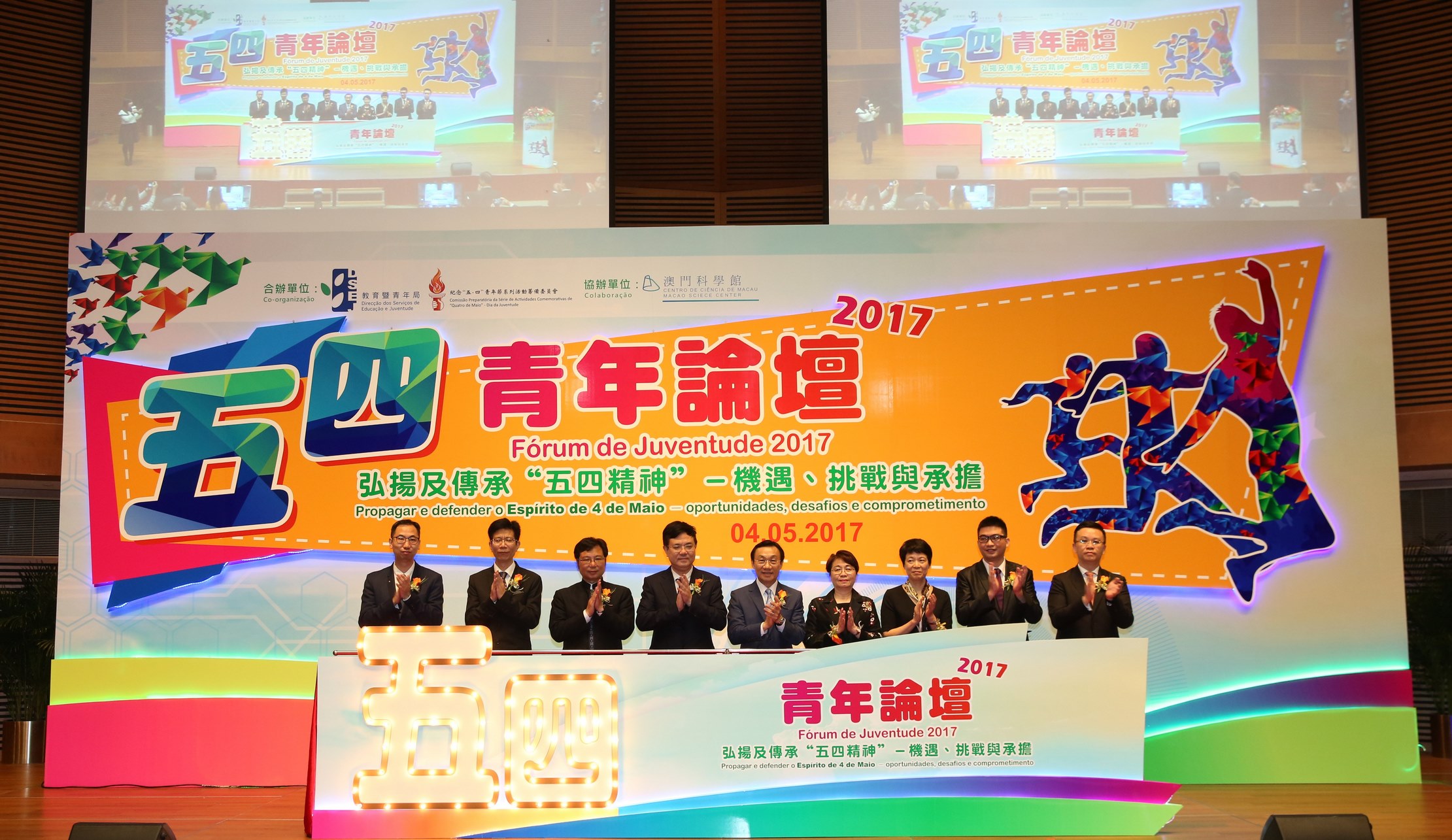 由教育暨青年局與紀念“五四”青年節系列活動籌備委員會合辦、澳門科學館股份有限公司協辦的“青年論壇2017:弘揚及傳承‘五四精神’——機遇、挑戰與承擔”於2017年5月4日(星期四)假澳門科學館會議中心舉行。社會文化司司長譚俊榮及中聯辦副主任薛曉峰出席並擔任論壇開幕的主禮嘉賓。內地、香港及澳門的專家學者和青年社團代表與澳門青年社團領袖和各地青年學生聚首一堂,互相分享和學習,提升澳門青年對“五四運動”的認識,推動他們關注國家及澳門的發展,充分體現青年在傳承及弘揚“五四精神”的重要角色。