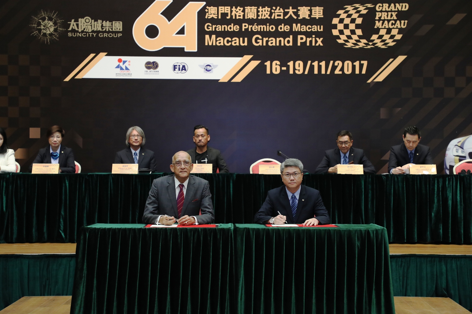 席間,澳門特別行政區政府體育局局長及澳門格蘭披治大賽車組織委員會協調員潘永權和太陽城集團行政總裁兼董事周焯華共同簽署贊助協議書並進行支票交接儀式。今年的賽事將正式命名為太陽城集團第64屆澳門格蘭披治大賽車,是太陽城集團連續第四年作為冠名贊助商。