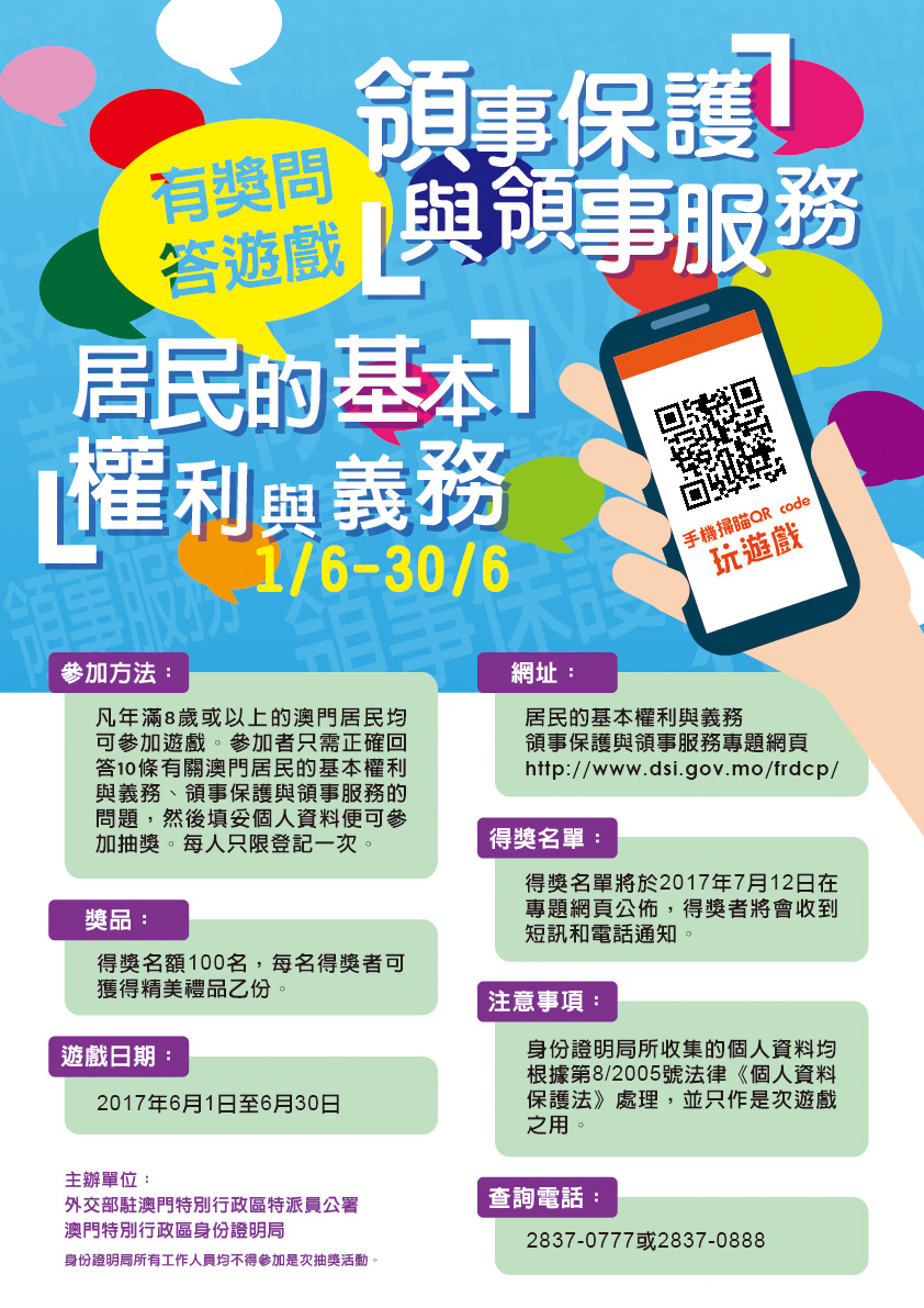 為加深澳門居民對居民的基本權利與義務及領事保護與領事服務的認識,身份證明局推出“居民的基本權利與義務、領事保護與領事服務”網上有奬問答遊戲,遊戲日期由即日起至2017 年6月30日。凡年滿8歲或以上的澳門居民可到身份證明局“居民的基本權利與義務、領事保護與領事服務”專題網頁(www.dsi.gov.mo/frdcp)參加遊戲,答對所有問題並填妥個人資料便可參加抽奬,得奬者可獲得精美禮物乙份,名額100個,歡迎市民踴躍參與。