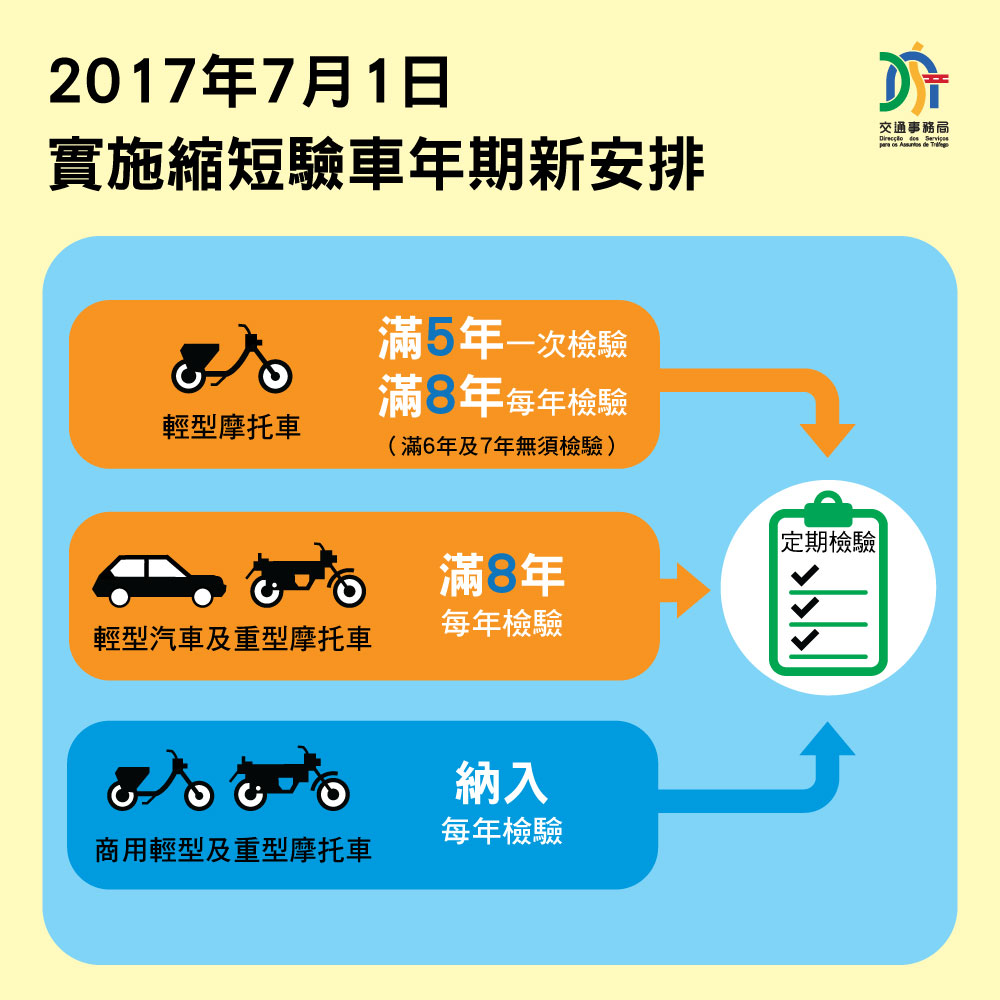 按照新修訂的《道路交通規章》第五十條第二款規定,今年7月1日起,輕型汽車及重型摩托車每年強制檢驗由現時10年縮短至8年,輕型摩托車則縮短至5年後一檢,8年後每年強制檢驗,而6年及7年的輕型摩托車今年無須受檢;是次修訂也將用作商業用途的輕型及重型摩托車納入須接受每年強制檢驗的範圍。有關安排旨在適當控制機動車輛尾氣的排放,加強車輛定期維修保養及進一步提高在用車的安全性。